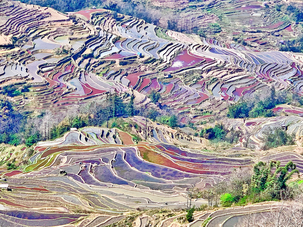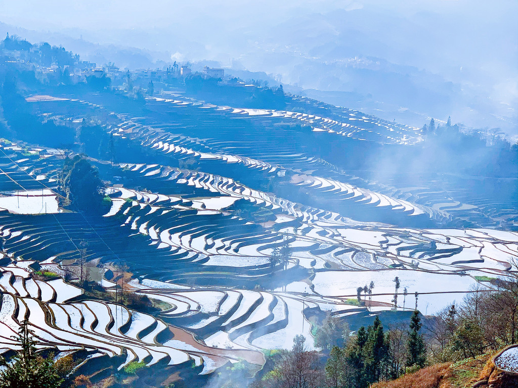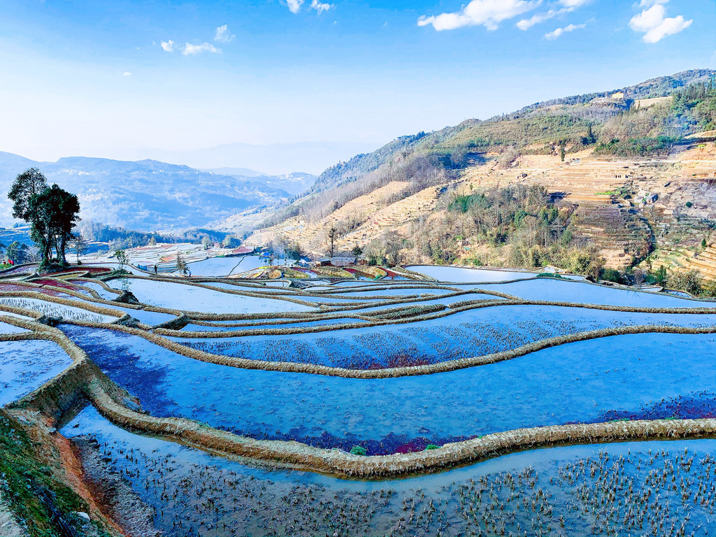 清晨在“爱春蓝梯田”看天空之境下的蓝色梯田。