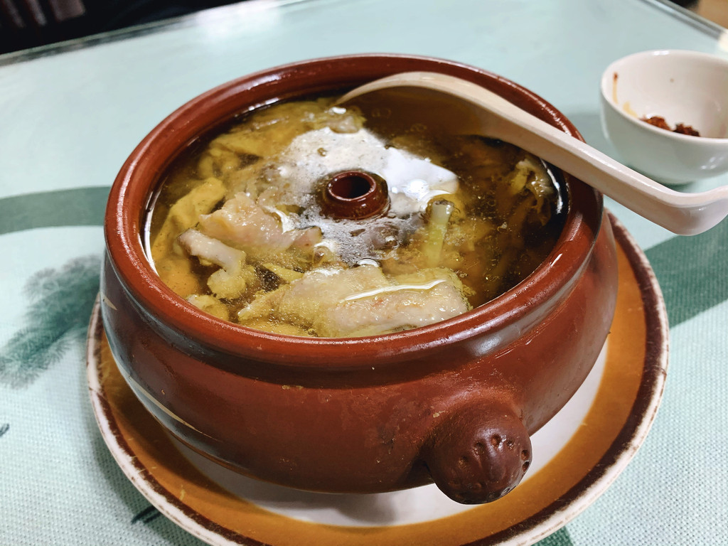 中午吃汽锅鸡,在建水古城中一家非遗传承店,汤汁鲜美,肉质软嫩。关键在于汤,汽锅里不能加入任何的水,完全是利用蒸汽高温加热,逼出鸡肉的油质和水份,所以汤汁要比一般的鸡汤。