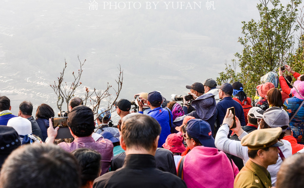 虽然我们五点多就到了观景台,但当我们到来的时候发现,观景台上早已被游客挤得水泄不通,观景栏杆处里三层、外三层地挤在一起,想要到看梯田都不容易,想要获得一个摄影位更是难上加难。