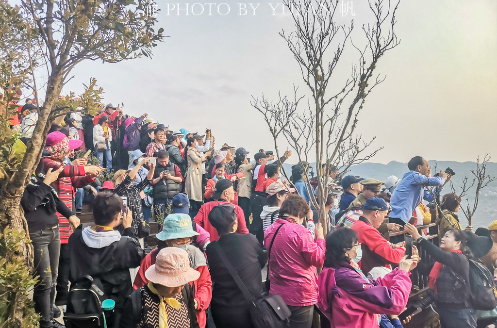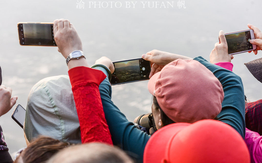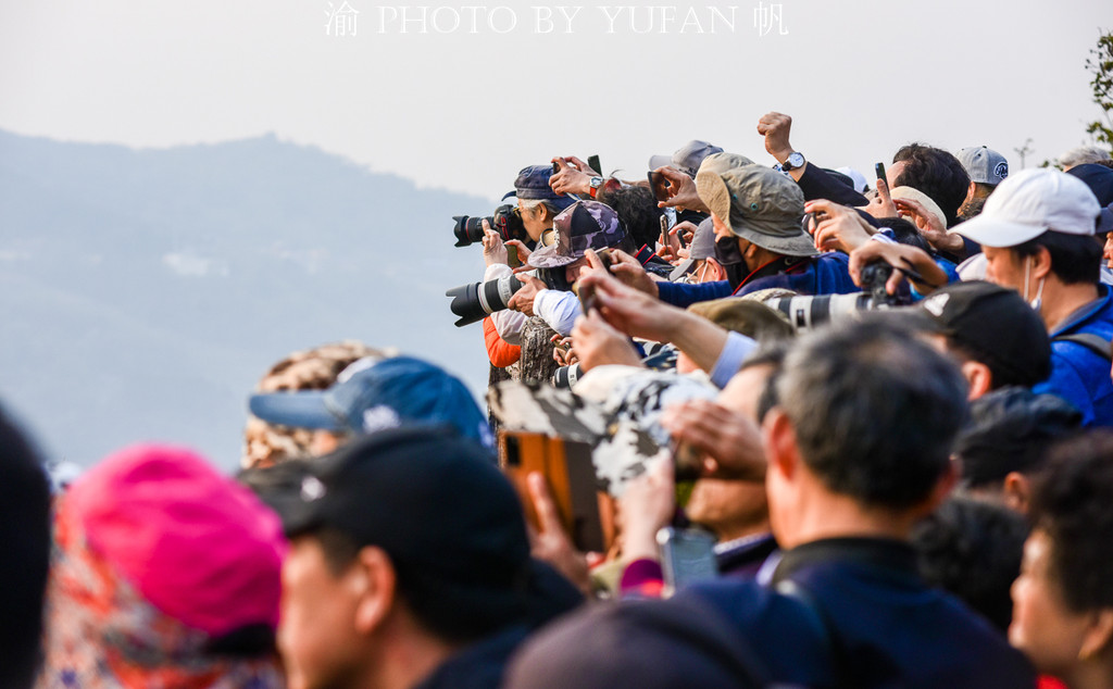 站在前面有位置的一些大叔,个个都扛着单反,据说是一个来自全国各地的摄影团,他们为了抢站好的机位,下午二点多钟便顶着烈日来到观景台排队了,一站就站在那里五个多小时,要知道它们基本都是65以上的老人家,这种精神真是令人钦佩。