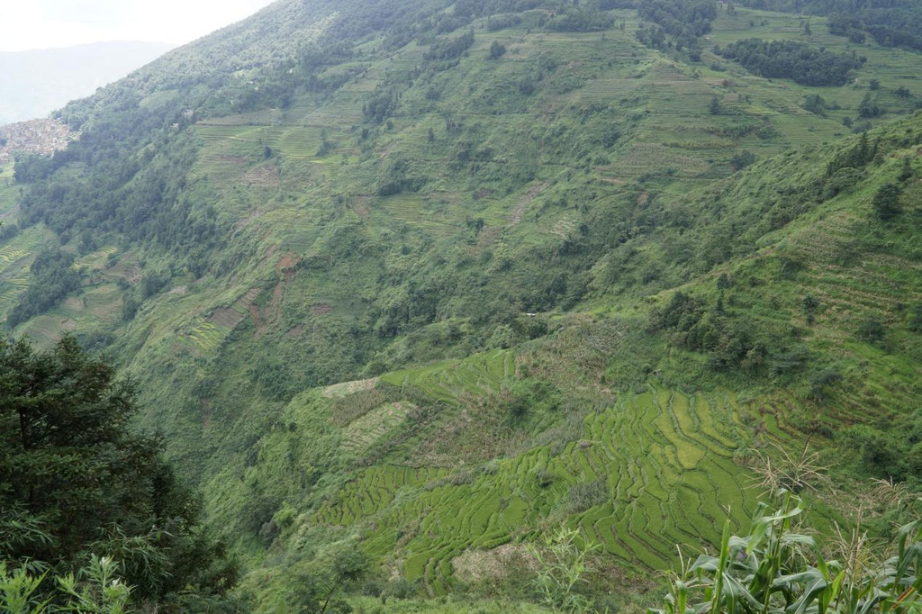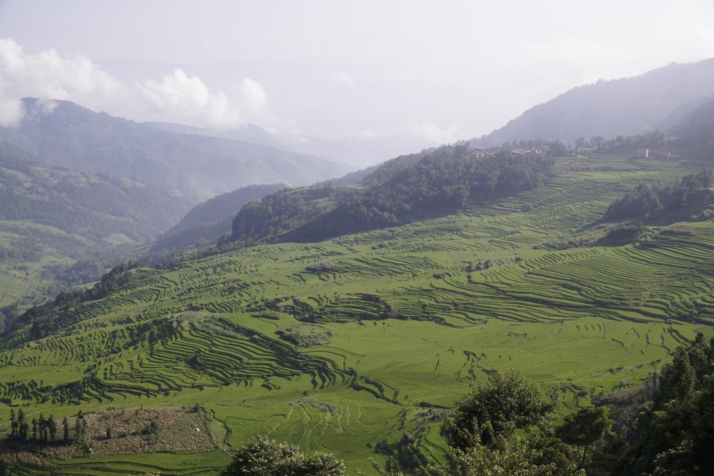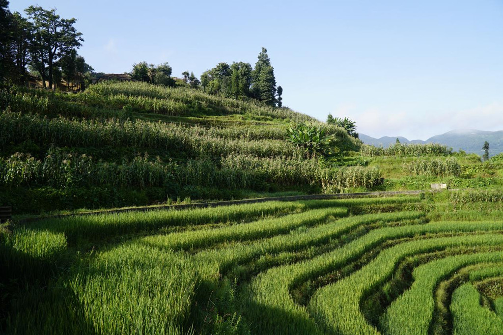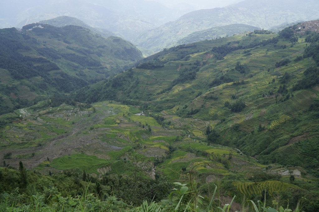 这19万亩梯田,坡度在15度至75度之间,坡缓地大则垦大田,坡陡地小则垦小田,甚至沟边坎下石隙也开田,因而大者数亩,小者仅簸箕大,往往一坡就有成千上万亩。梯田最高级数达3000以上。