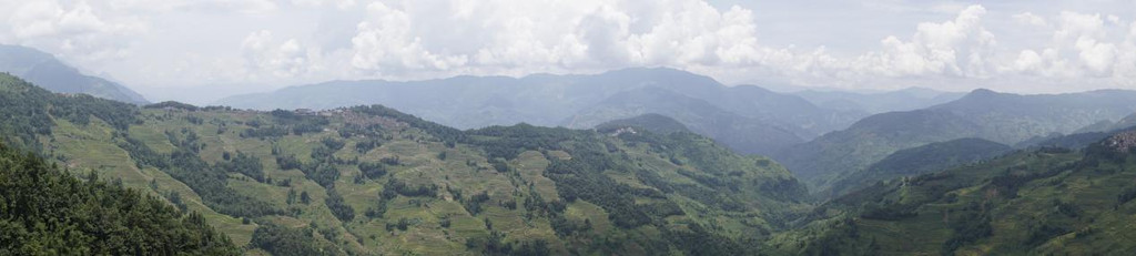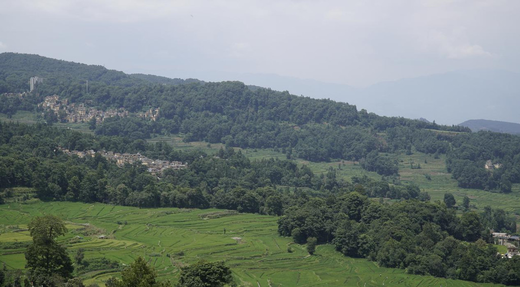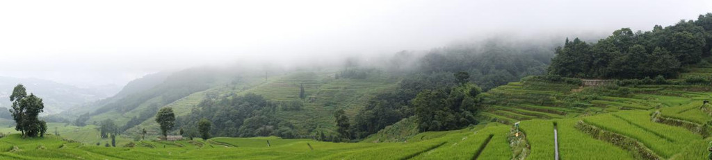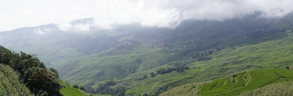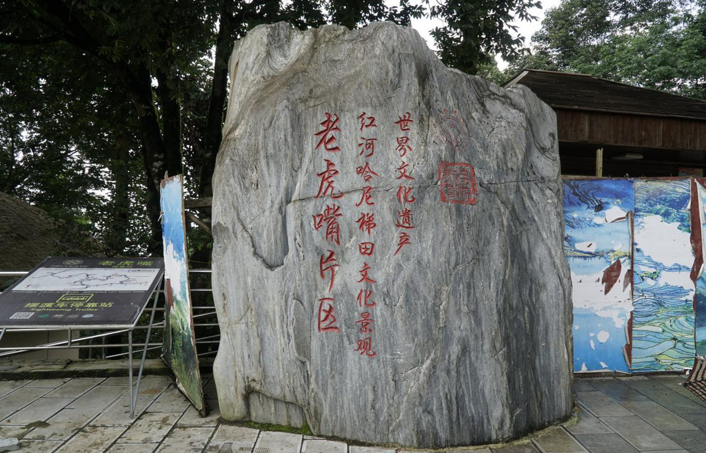老虎嘴景区有近6000亩梯田,是观日落必到之处。8月的雨季大水冲毁了一些梯田。这个季节确实不是观赏梯田的最佳季节。稻田的绿稻和周边的草木把色彩混在了一起,稻田里的水被稻禾遮挡,没了水面反光的效果。我不是摄影师,拍不出什么好片子。不过来到这有千年历史的元阳梯田走一走,还是值得的。