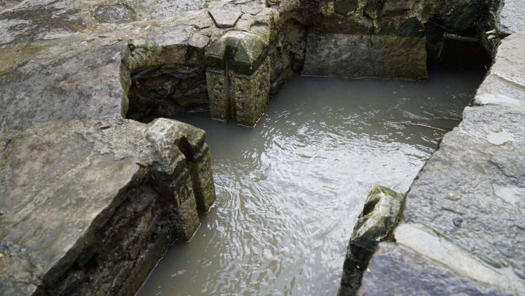 在石槽中插入木板挡水,就可以起到分水的作用。