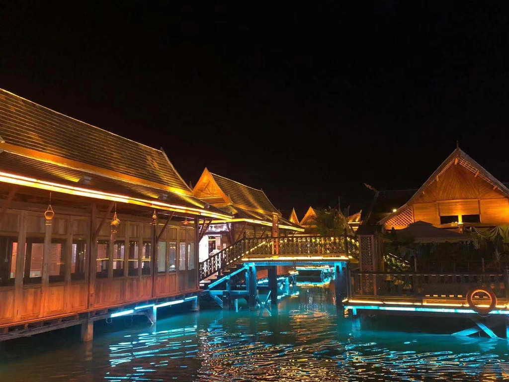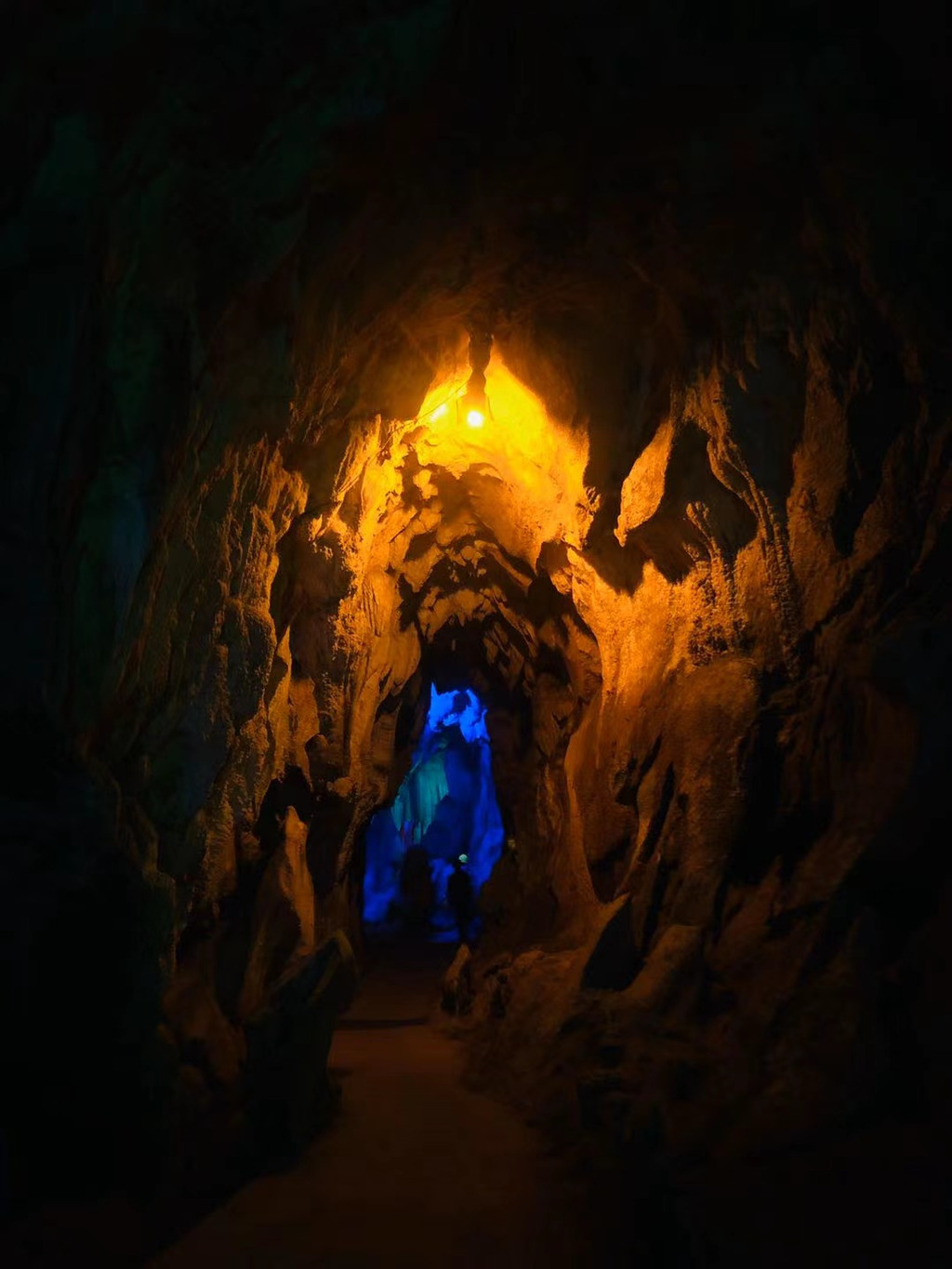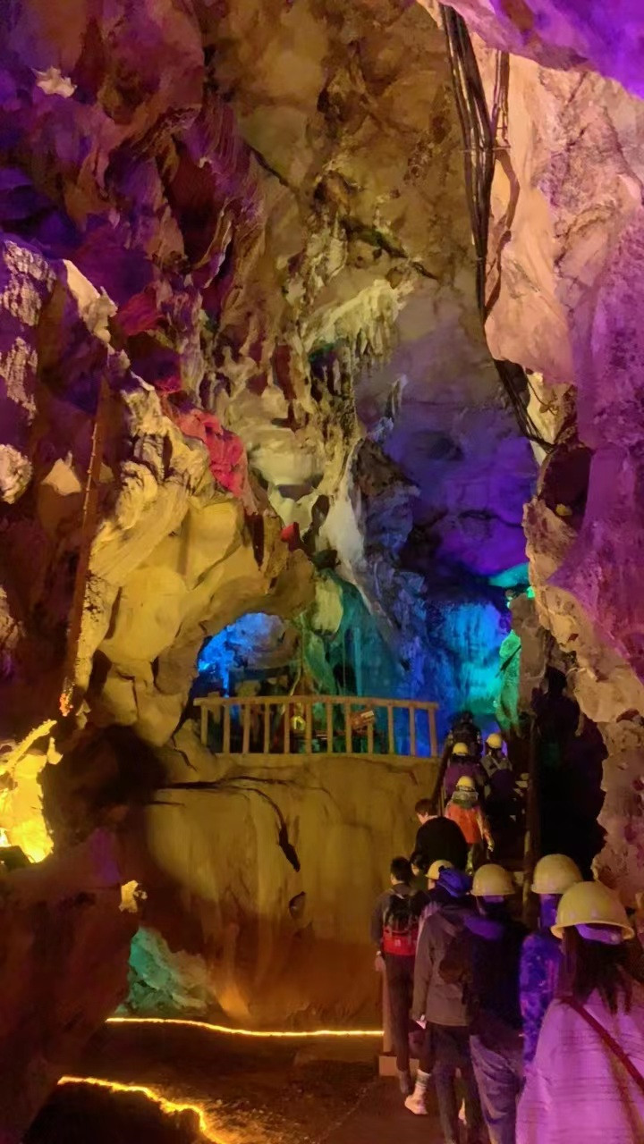 初探溶洞常规路线,有大部队在五彩灯光照映下前进;