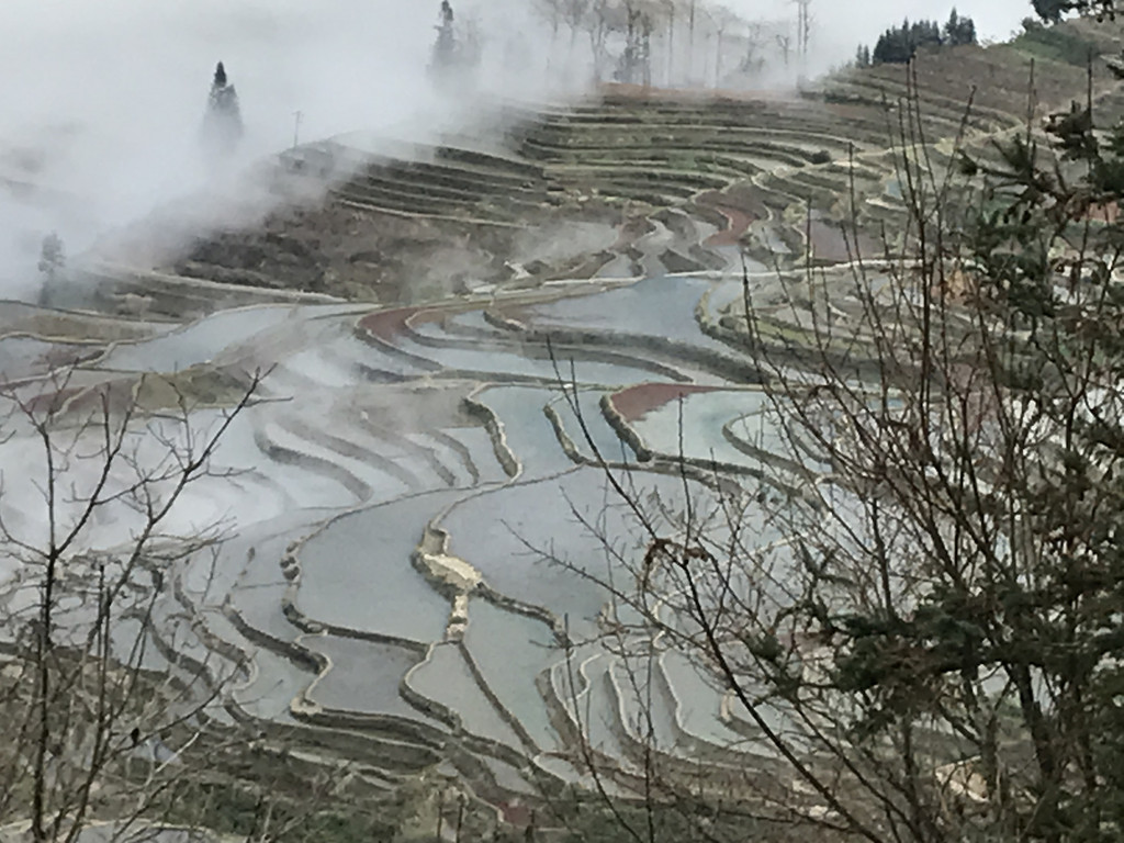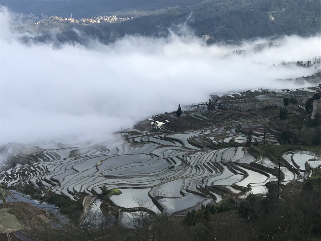 12号早上吃完早餐,让酒店管家开电瓶车载着我们在森林公园游了一卷,拍的是视频.很美,不知道为什么不能上传。中午11点开车去红河哈尼族元阳县。元月份到四月份是看梯田的最佳时期。开了6小时才到我们订的民宿,一路盘山公路,越往上开云层越厚,哈尼族人的特点就是在山上有一点平地就开垦梯田、建筑房子,依山而居。从他们的观景点可以看出哈尼人的定居习俗。