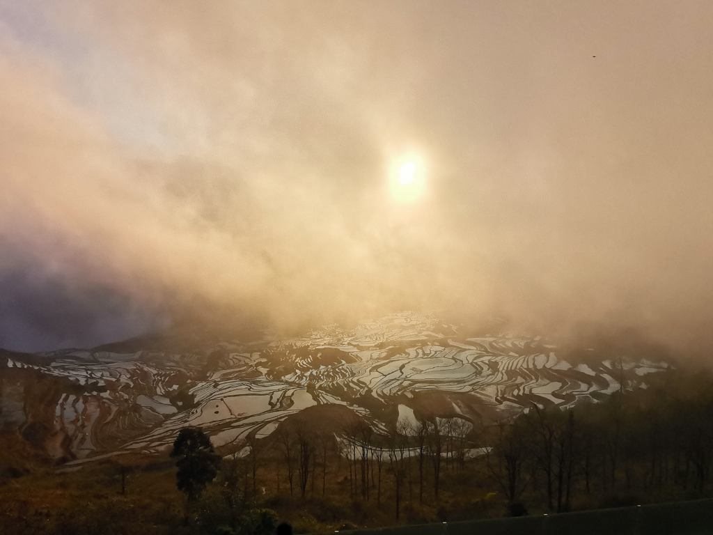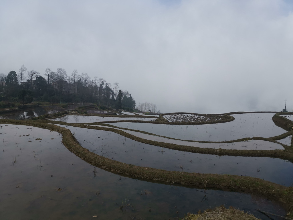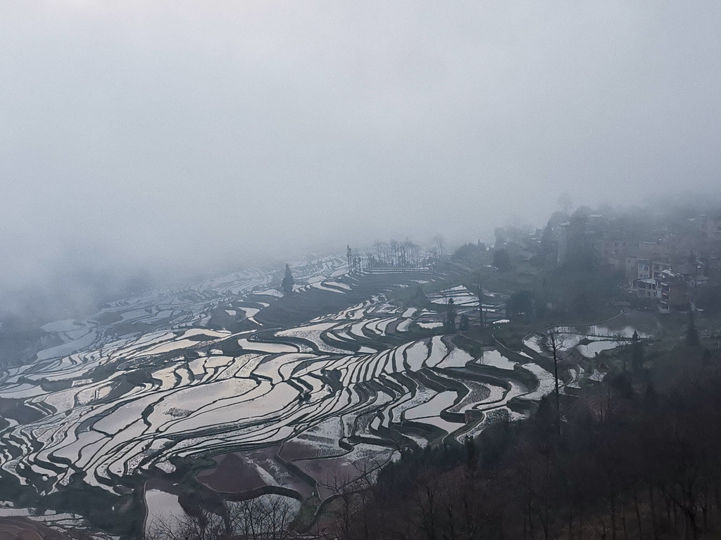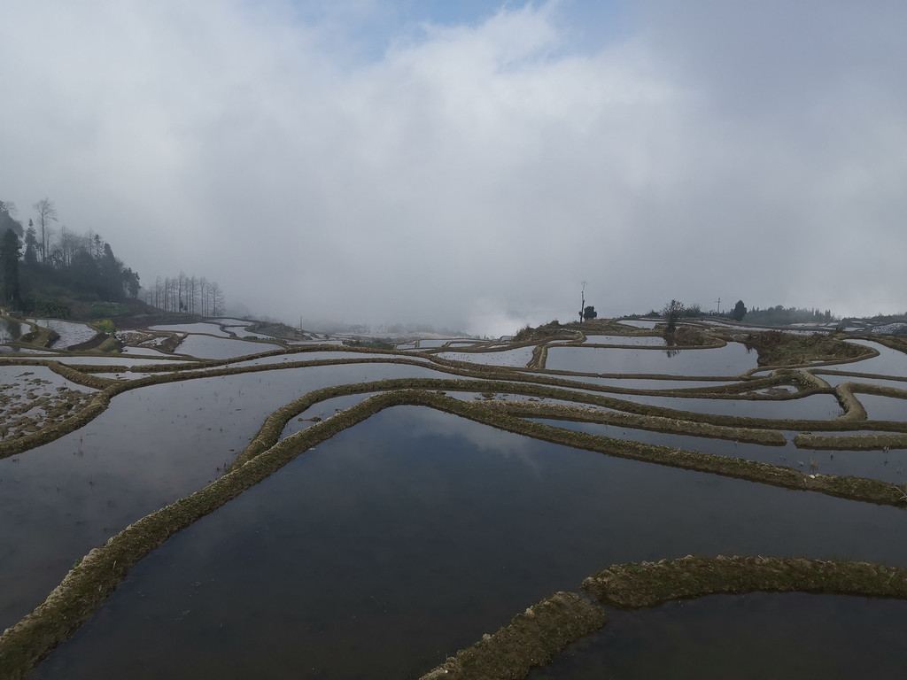 当天,多依树梯田一派山涧云汉低垂、雾气弥漫于田野,梯田村落皆被浓雾紧锁。在此,我们心心念念几个小时,最终,也没看见旭日霞光的踪影。看来,今天的多依树:是看日出没有,看云雾还不错!而云雾朦胧之中的多依树,倒也有种别样之美 !