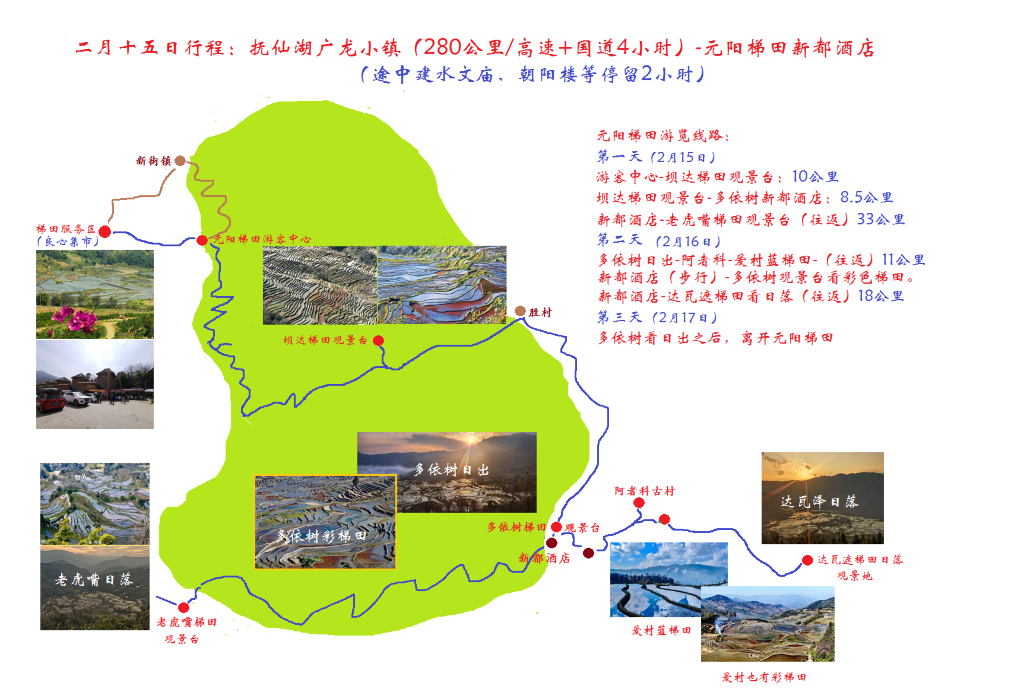 元阳梯田是我们此行的“重头戏”,千里迢迢来这里不容易,我们不会再来,也不留下遗憾。此行元阳梯田既定行程2天2晚。我们的计划是:2月15日下午游览坝达梯田,傍晚去老虎嘴梯田看日落。2月16日清晨,多依树梯田看日出,随后去爱村蓝梯田,返回酒店途中顺道阿者科,下午再去多依树看彩梯田,傍晚去新开发的达瓦遮梯田看日落。2月17日清晨再去多依树梯田看日出,之后,离开元阳去云南罗平。