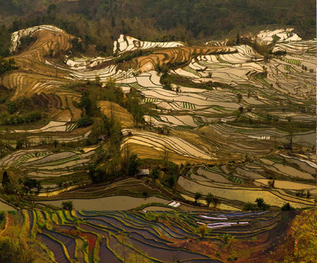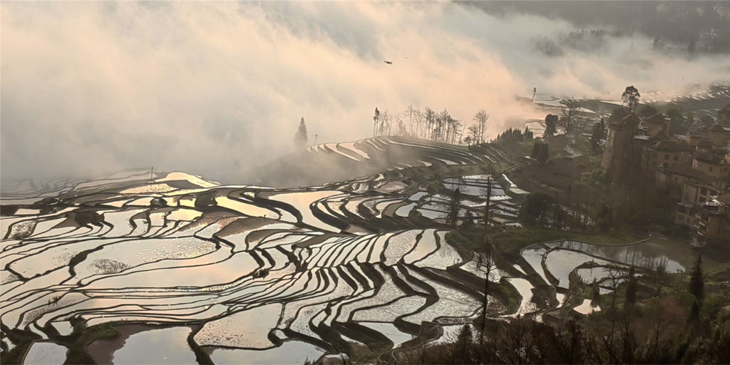 眼前一派万物生辉,天地之间金光灿灿,梯田仿佛变成调色板,光与影已成为画笔;无需任何浓妆淡抹,也无需任何描述,目及之处皆为大自然的震撼、这是一场独一无二的视觉盛宴;此刻,你无需什么摄影技巧,只要用心阅读、用眼记录就够了!这就是元阳梯田的经典日落景象,一幕无数天下客苦苦寻觅的时刻!