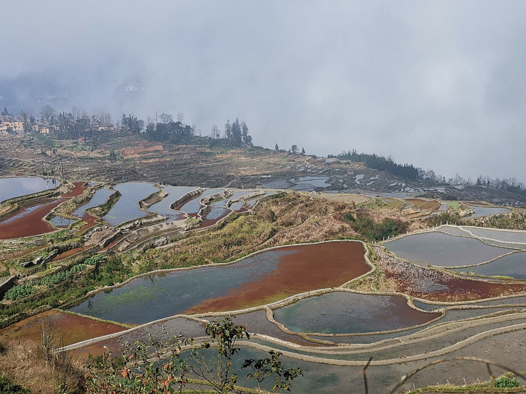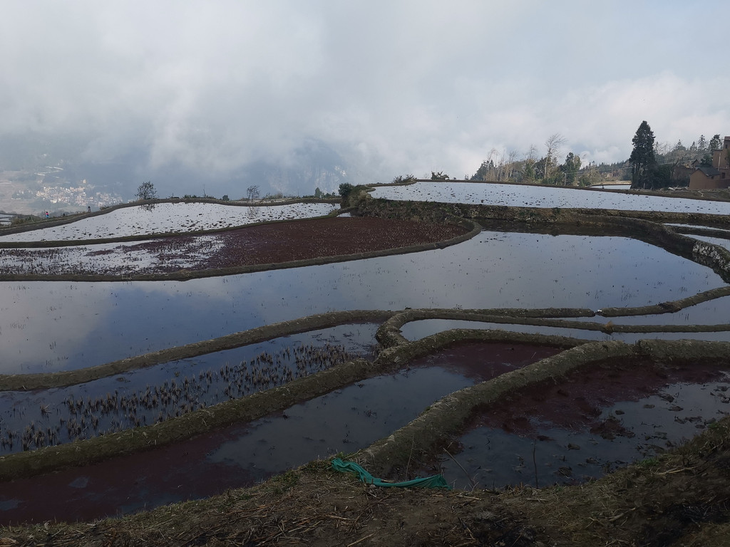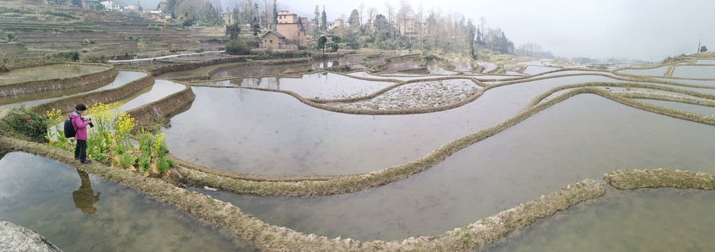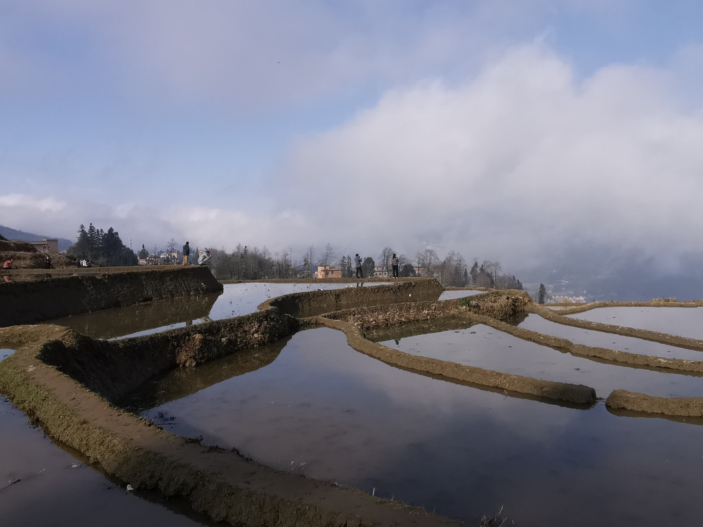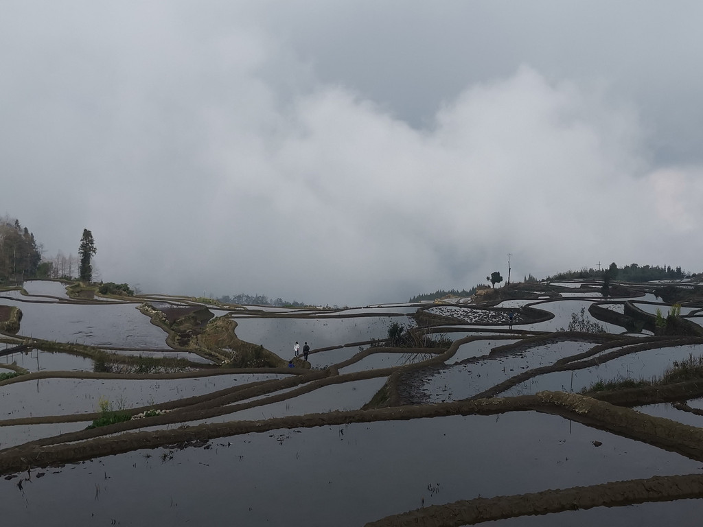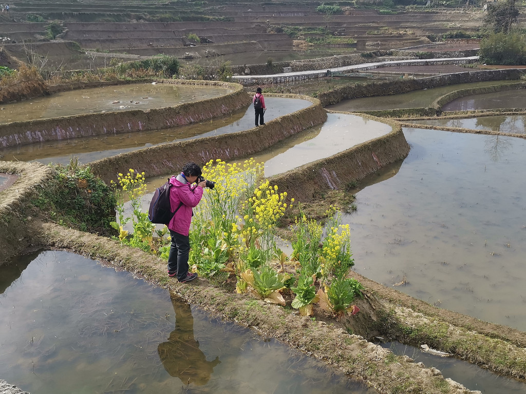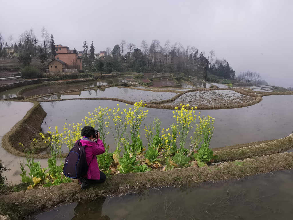 当天,我们沿着村里的机耕道一路走到梯田底部,本以为能看到更美的蓝梯田。但随着地势越来越低,雾气也越来越重,之前的蓝梯田已不见了踪影,取而代之却是一片不错的彩梯田。