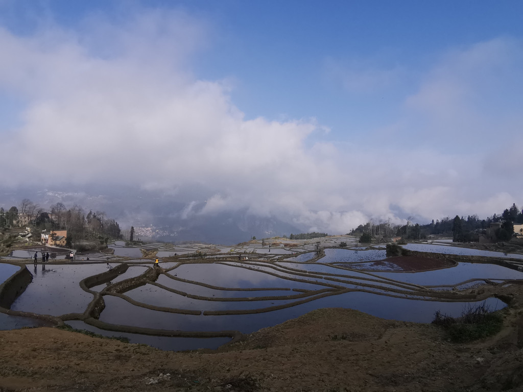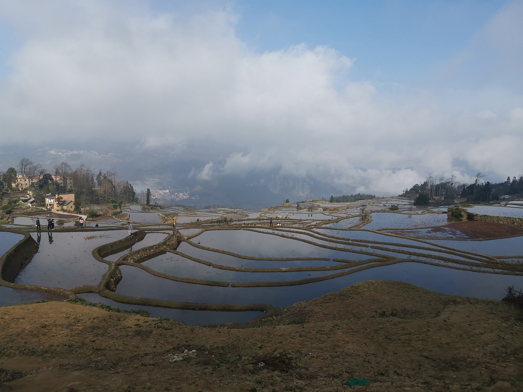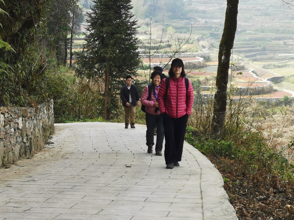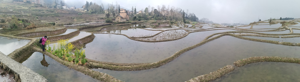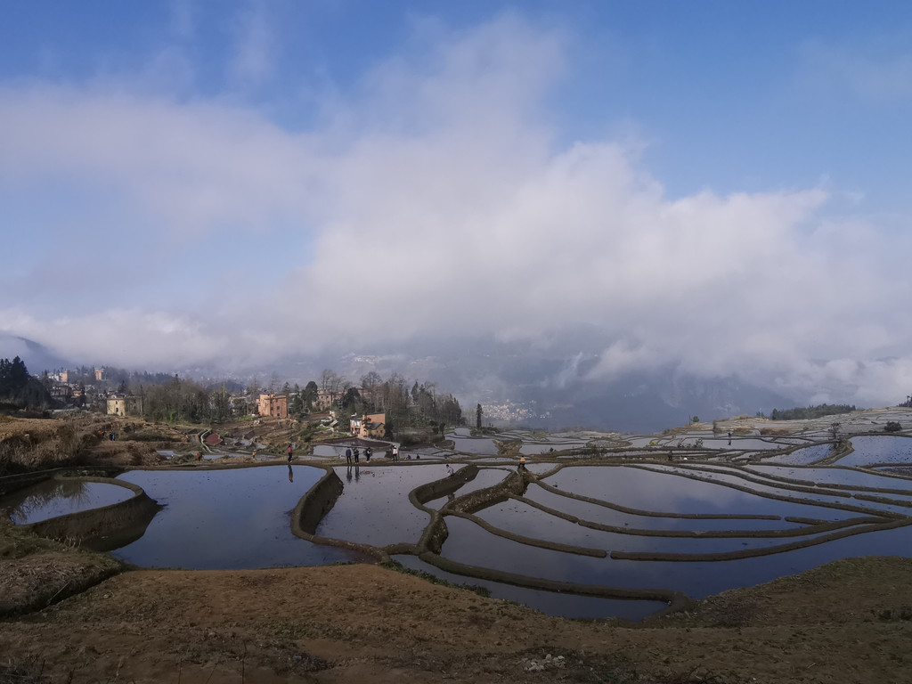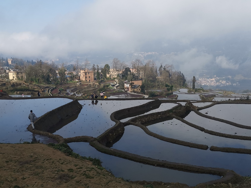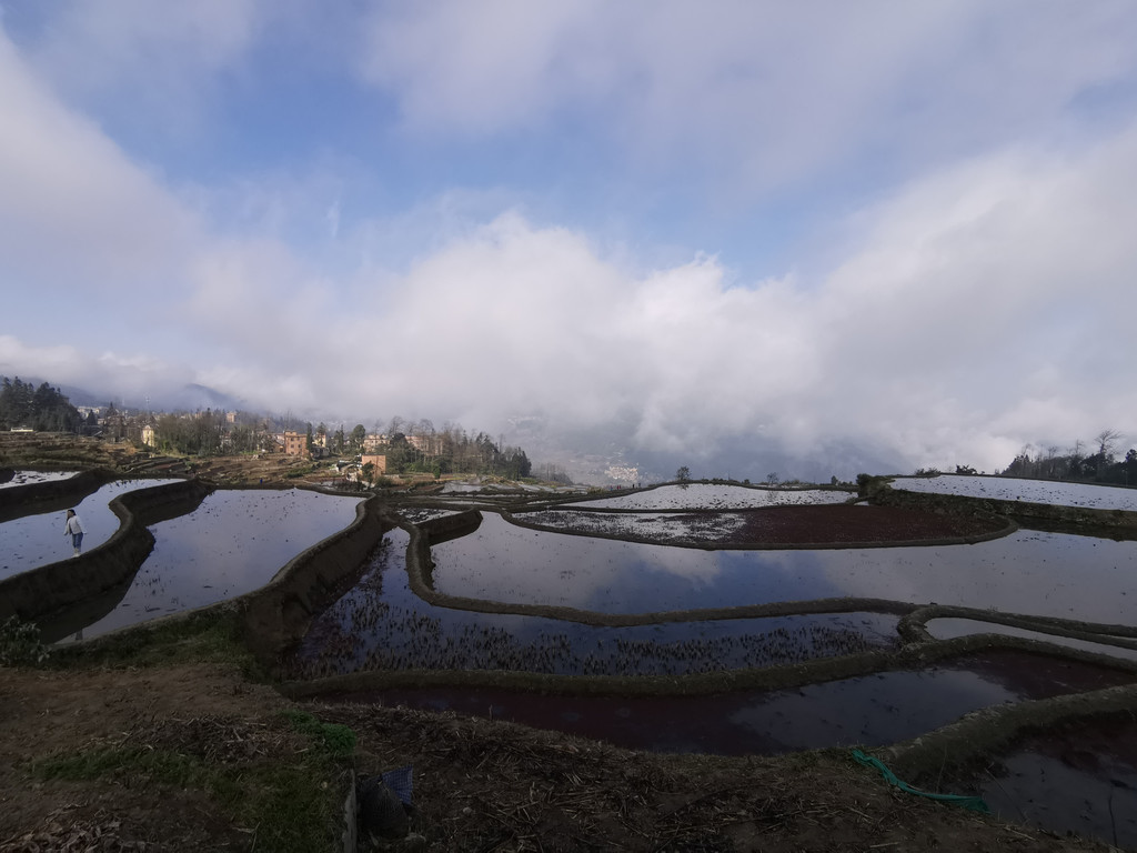 当天,我们沿着村里的机耕道一路走到梯田底部,本以为能看到更美的蓝梯田。但随着地势越来越低,雾气也越来越重,之前的蓝梯田已不见了踪影,取而代之却是一片不错的彩梯田。