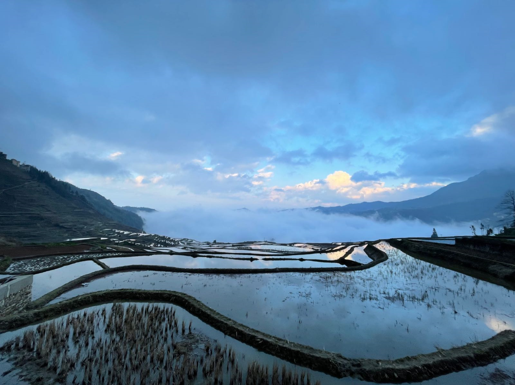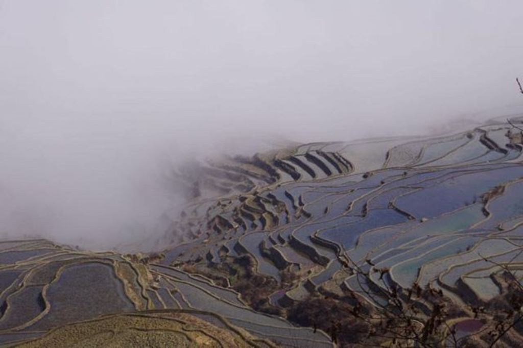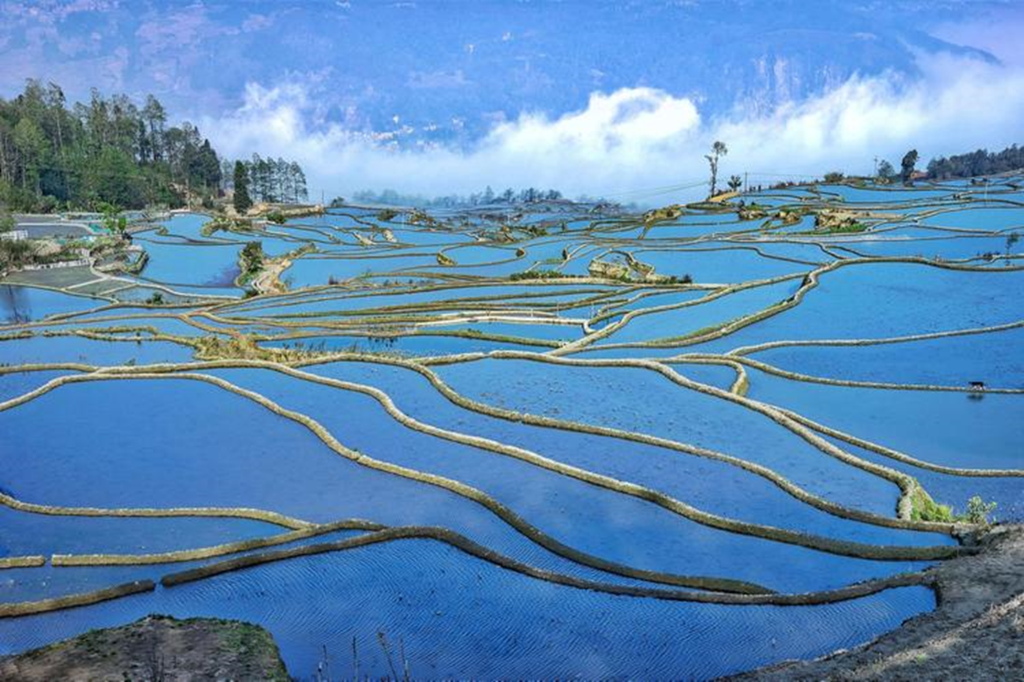 随着雾气消散,水田开始逐渐变蓝,眼前的蓝梯田渐入佳境。
