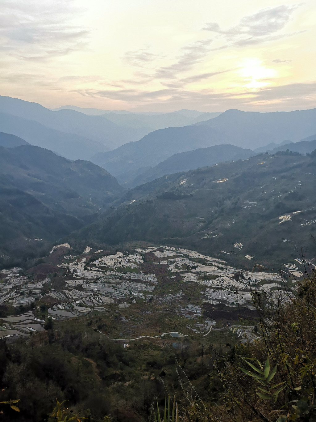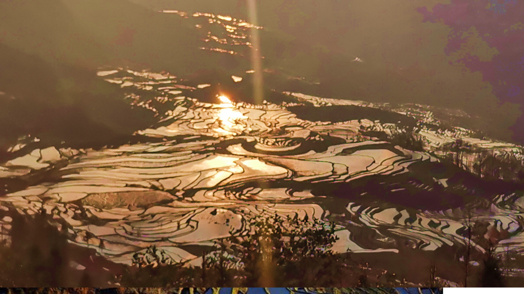 (老虎嘴日落录像一瞥)其实,老虎嘴看不到真正意义上的梯田日落(多依树看日出也是如此)。美轮美奂的梯田日出/日落,并不是太阳落在梯田里,而是晚霞映红天空,霞光反射到梯田里,此刻梯田就像被打碎的玻璃,呈现五光十色,光影非常绚丽!而要想看到这样的梯田景观,不但要空气通透、云层高度厚薄适宜,风速条件也要好。总之,想看到出彩的梯田日落/日出景象,需要天时和运气!