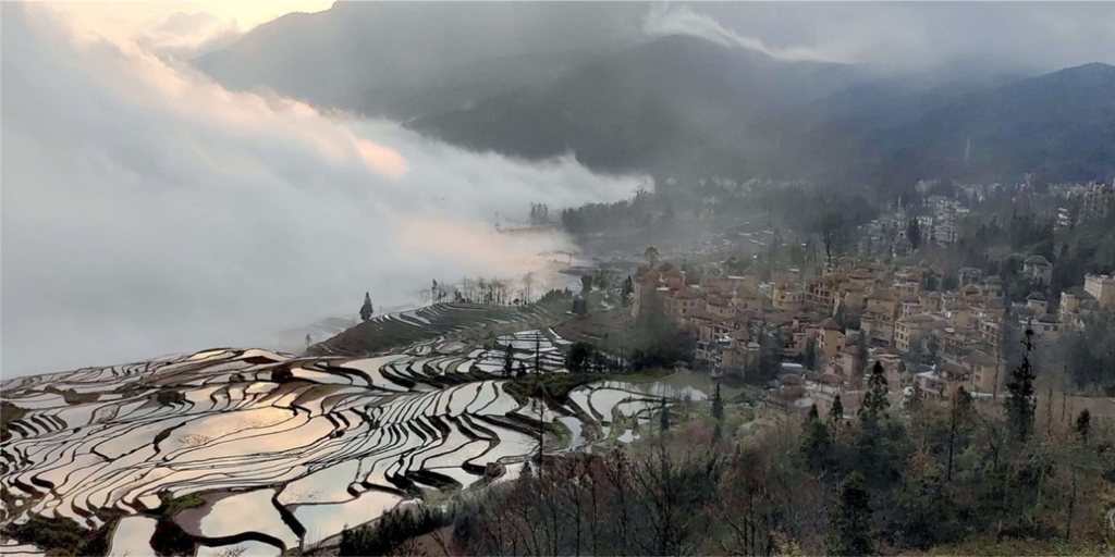 “一坡风光万面镜映照天地容颜,半倾田畴千年情雕刻水稻人生”。此刻,你站在多依树的观景台上,面对眼前的梯田美景,你完全理解这首诗的含义并由衷感悟:滔滔红河水,巍巍哀牢山,不但孕育了这片好山好水好田,也承载了灿烂的华夏农耕文明! 勤劳智慧的哈尼人在此世代耕耘,把这半亩田畴做成了“一坡风光万面镜”,把水稻人生塑造成了世界鼎级的文化遗产!