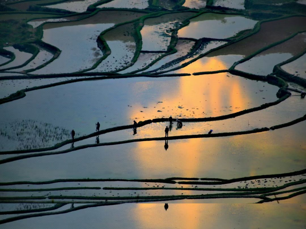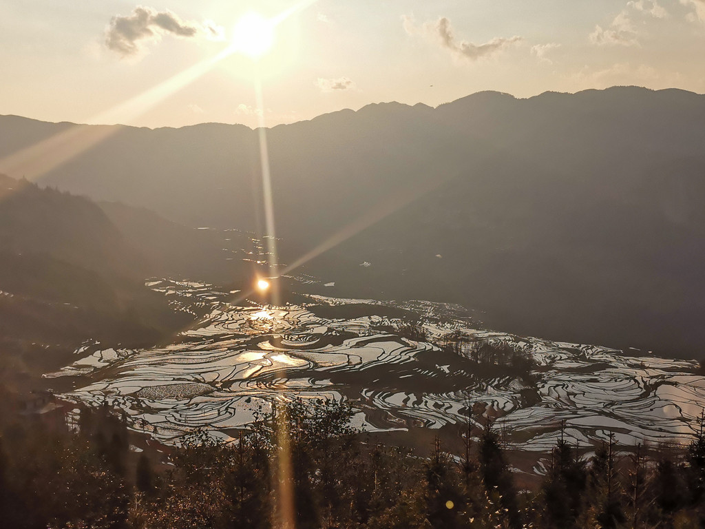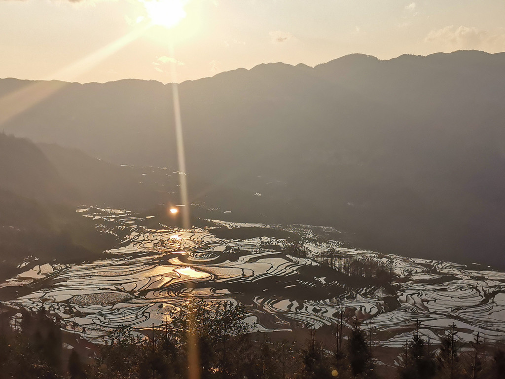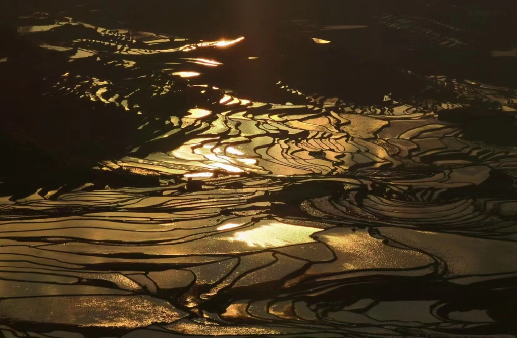 今晚的元阳梯田天高云淡,夕阳高挂于山巅,霞光普照天空大地,水田之中泛着金光,此刻无声胜有声!我们亲历了元阳梯田的一个高光时刻!