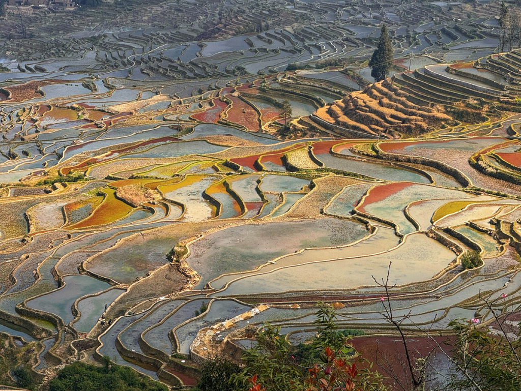 观景台一图看懂梯田色彩变幻。此刻,你仔细观察梯田在阳光照射、流云遮盖、空气通透度等影响之下,所呈现的色彩光影变化,就会发现只要上述条件不同,梯田的色彩表现也不同(其中的红色田块,是因水中生长一种红色浮萍所致,蓝色梯田则直接与光照有关)。可以说,多依树的每一天都充满了灵动和情趣。无论是清晨的雾气缭绕和云海日出,还是白天的色彩不断变幻,这里时刻都有不同的美景等待你去发现和体验。