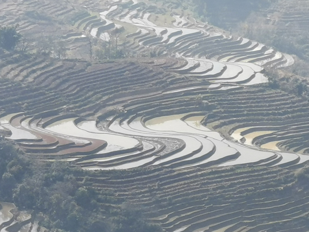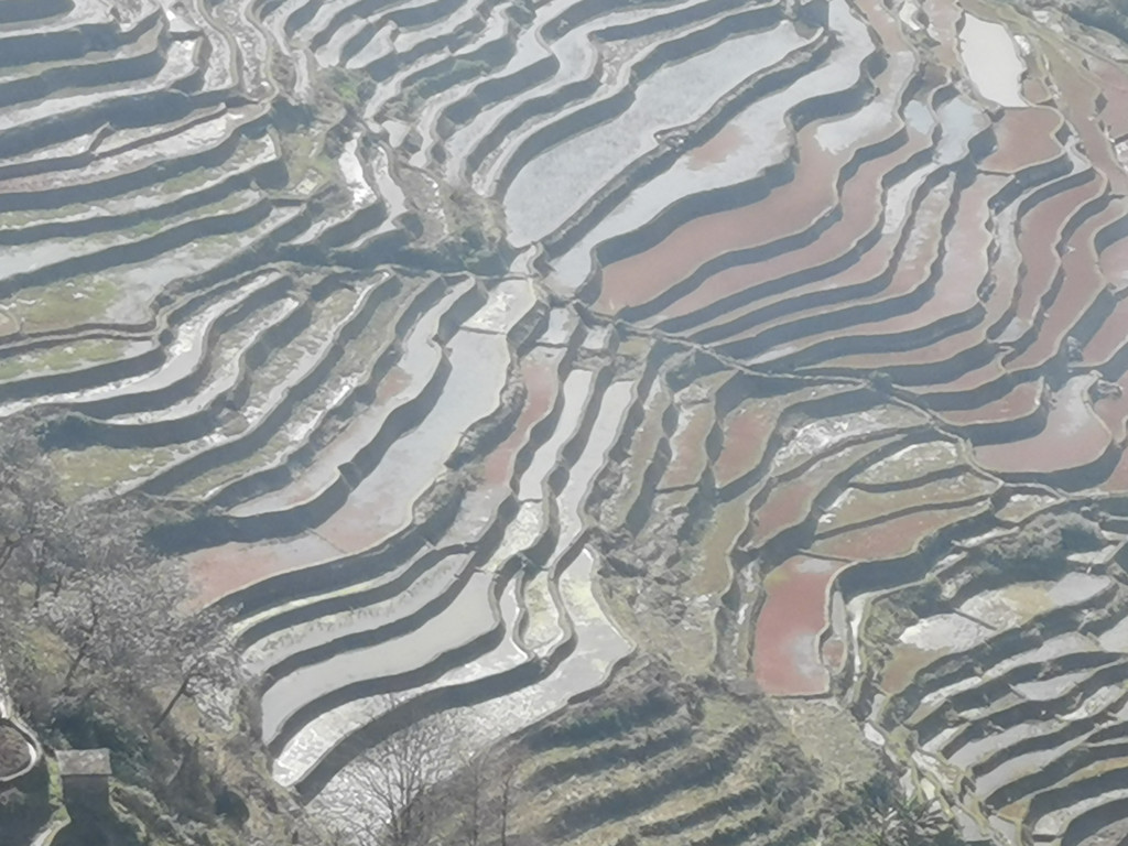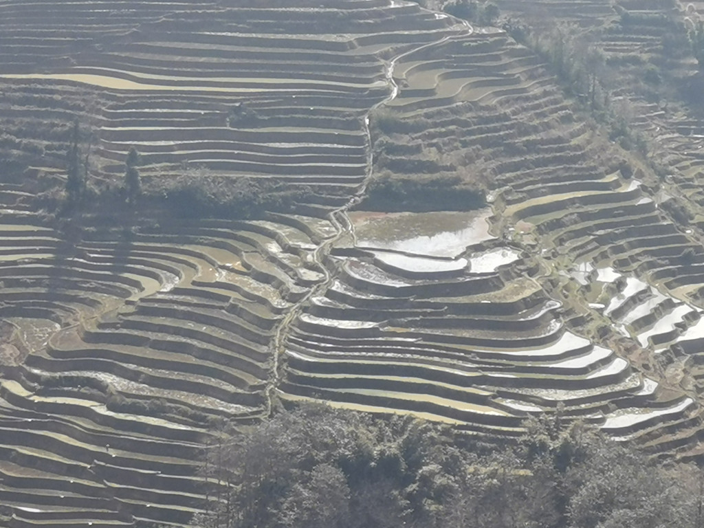 我们来到坝达景区当天,由于梯田上空风很大,空气通透度不算好,而且是逆光拍照,手机拍摄梯田显得光线太强,焦距不足,故拍出的效果形似“鸡肋”,无论如何也表达不出坝达梯田视觉传达的冲击!