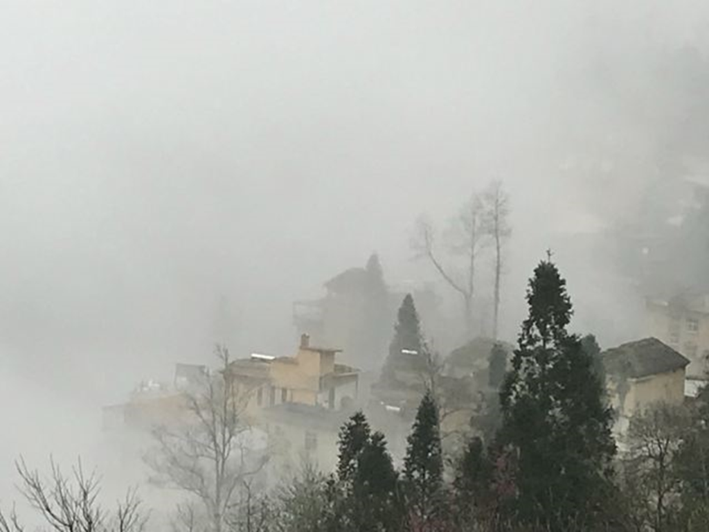 (爱村看蓝梯田录像一瞥) 2月16日上午约9点时分,按既定行程,我们在酒店早餐后来到蓝梯田。当天,这里的情景与清晨在多依树观景台上一样,仍然是浓雾紧缩,雾气弥漫,此刻蓝梯田并不出彩。