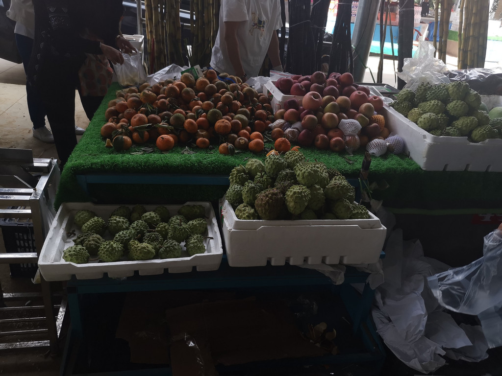 集市里的释迦果/4元1斤、苹果/4元1斤、红杏/2.5元1斤、橘子/2.5元1斤。而且,这里水果的口味非常好,尤其是苹果和橘子入口鲜甜松脆(下图的红色水果,大的是苹果、稍小是橘子)。