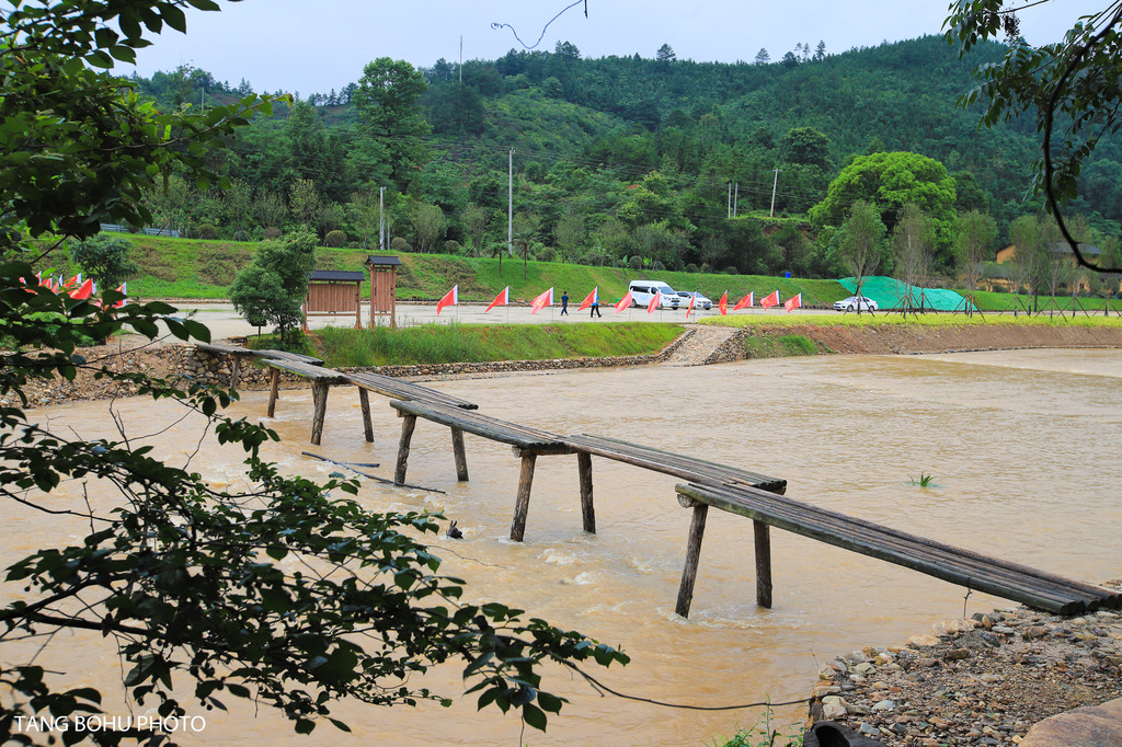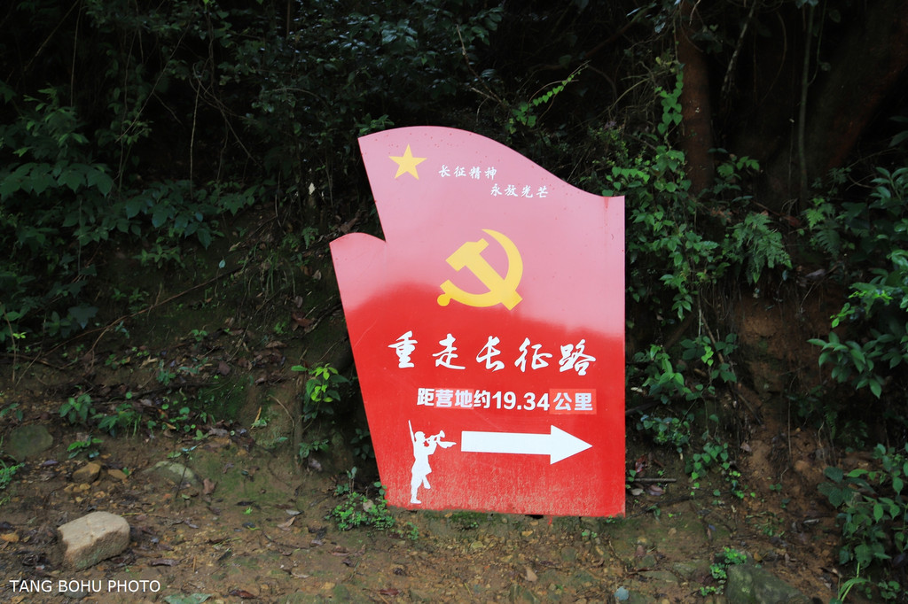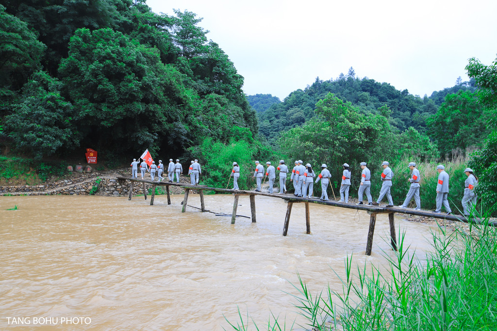 这里就是长征路中的其中一段,刚刚下过雨,河水比较混浊,河水湍急,游客举着旗开始重走长征路,这一段的长征路全长有19.34公里。走过这座木桥,沿着小路走进了茂密的森林里。下过雨的泥泞的小路一不小心就容易打滑。