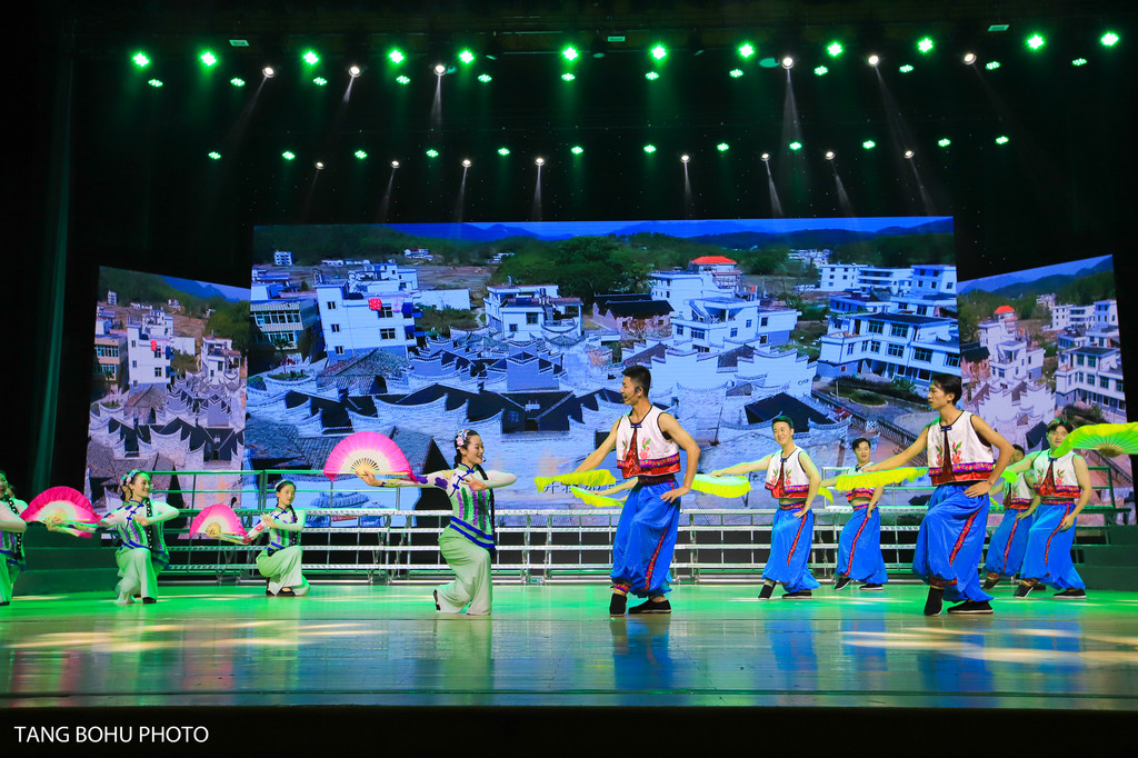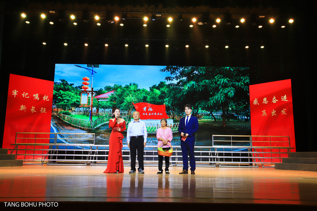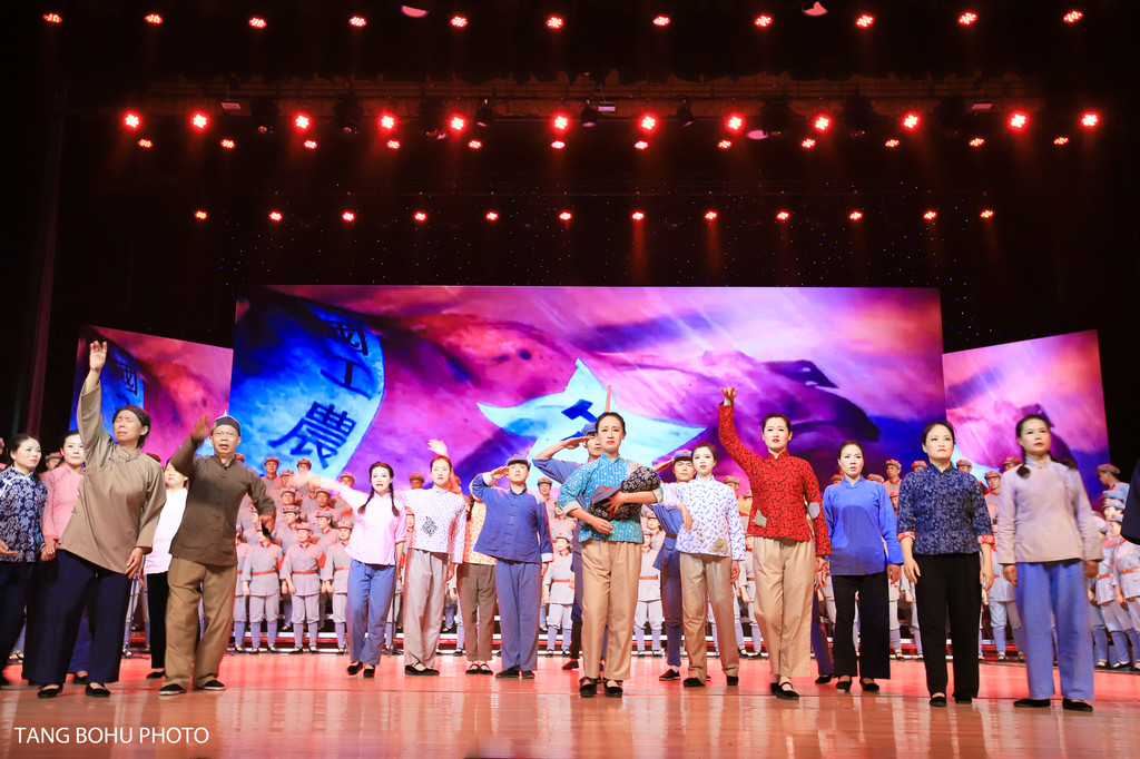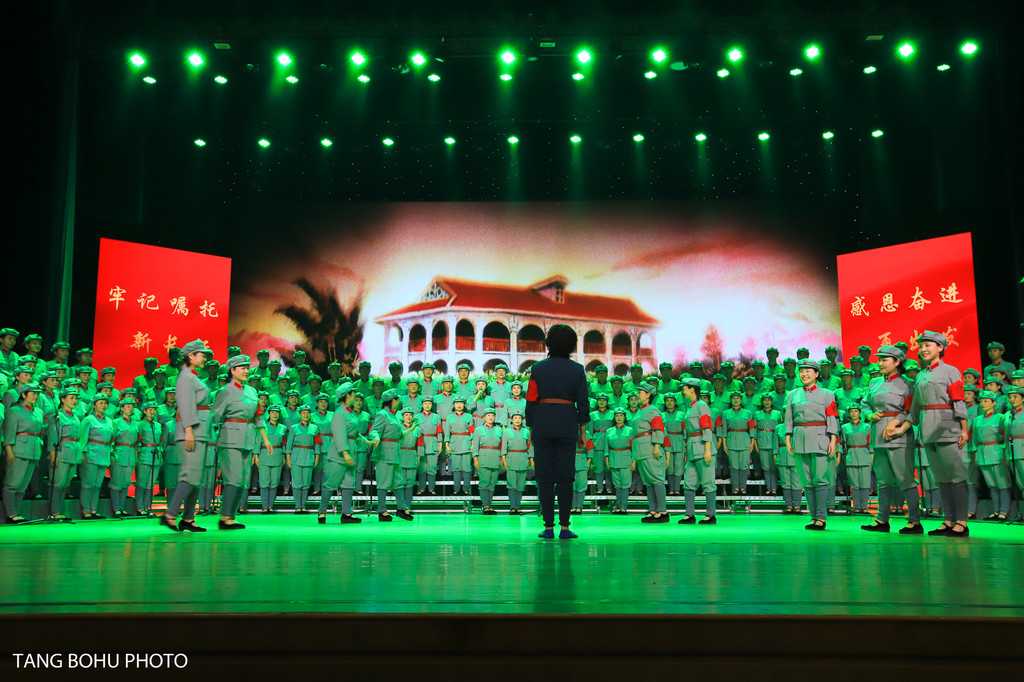 江西于都县是长征集结出发地,是长征精神的发源地。来到于都有幸观看了《长征组歌》第500场公益演出。为了唱响主旋律,弘扬长征精神,传递正能量,于都县的100余名红军后人自发组建成立了长征源合唱团,以展现长征历史的《长征组歌》作为该团的主打精品节目,当天晚上下着雨也没有阻挡观众们来观看演出的热情,长征源合唱团成立11年来,在全国长征沿线的重要纪念地都留下了他们的足迹。一幕幕精彩的演出仿佛把我带入了斗志昂扬的那个时代。每一幕演出都赢得了在场的观众的阵阵掌声。
