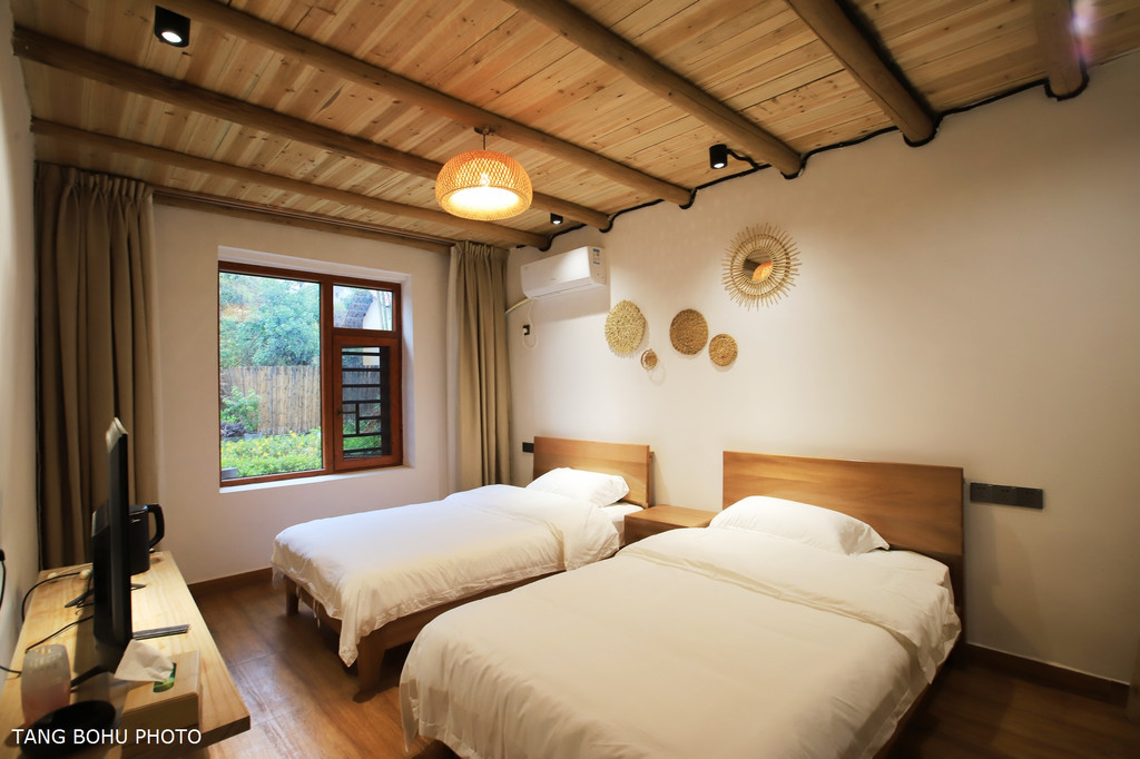 民宿房型有很多种,房间里的设计风格都差不多,有大床和双床可选。晚上的时候很安静,因为以前这里是林场仓库,外观保留了以前的样子古色古香。