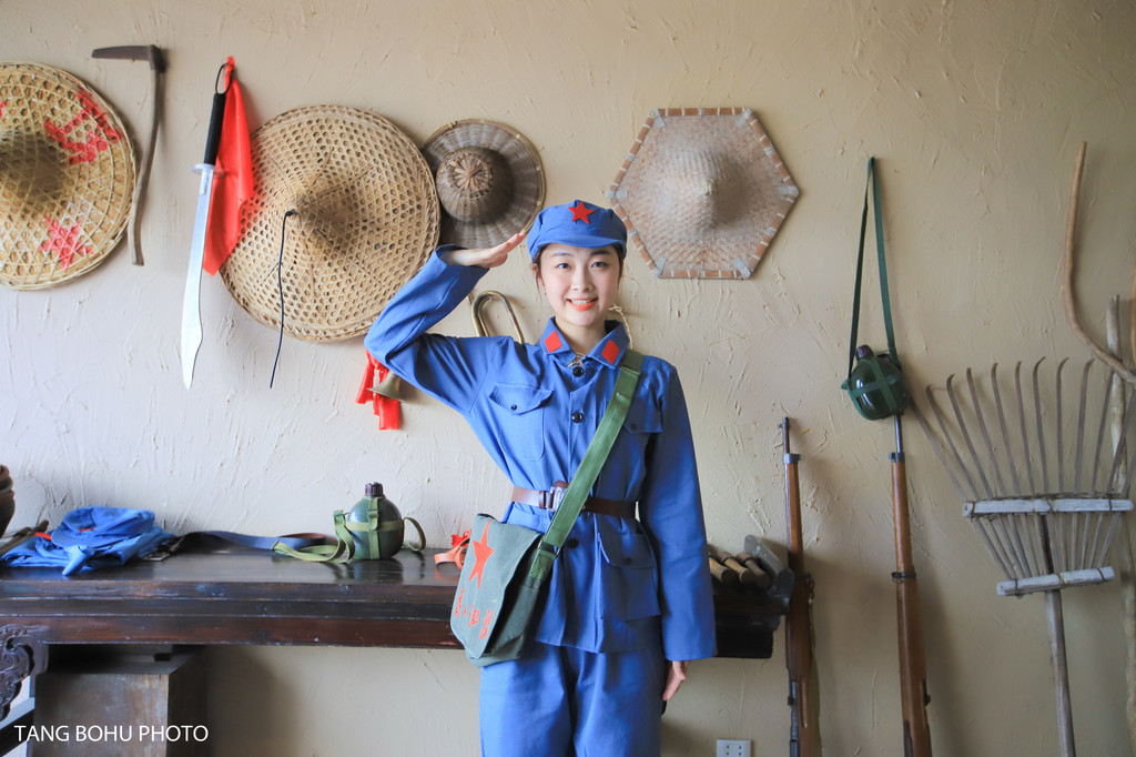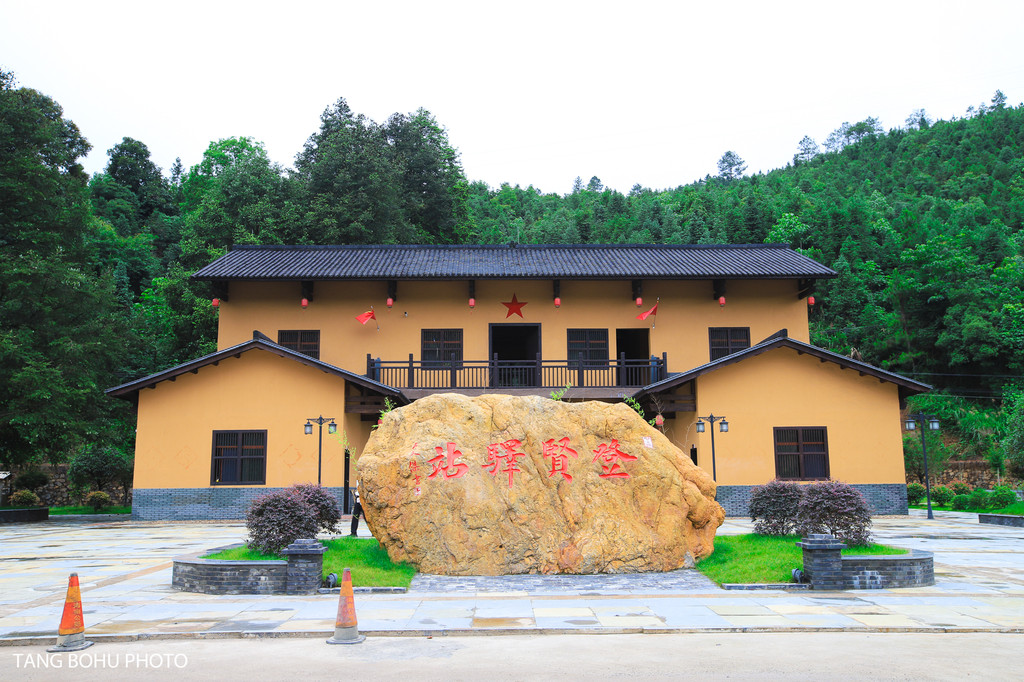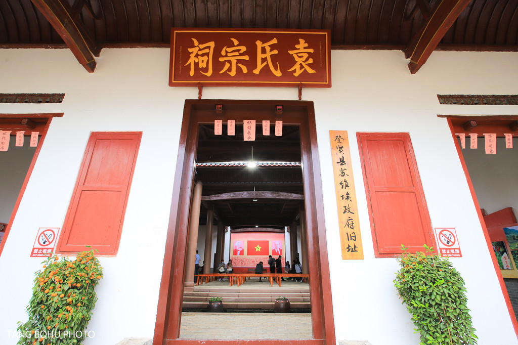 感受重走长征路后,我们到来到了袁氏宗祠,这里是登贤苏维埃政 府的旧址,刚刚到到这里的时候又遇到了那群从广东过来的游客,他们正在门前拍照留念,宗祠里面有放着很多椅子供游客休息,还有桌子,墙上挂满了以前这里关于长征的老照片还有新照片。在这里你可以更进一步的了解当年长征的事。