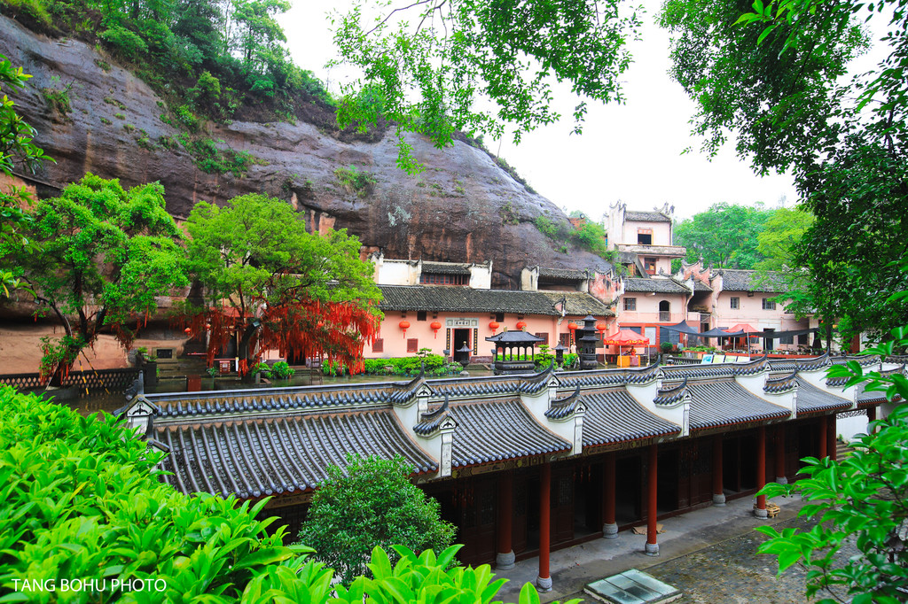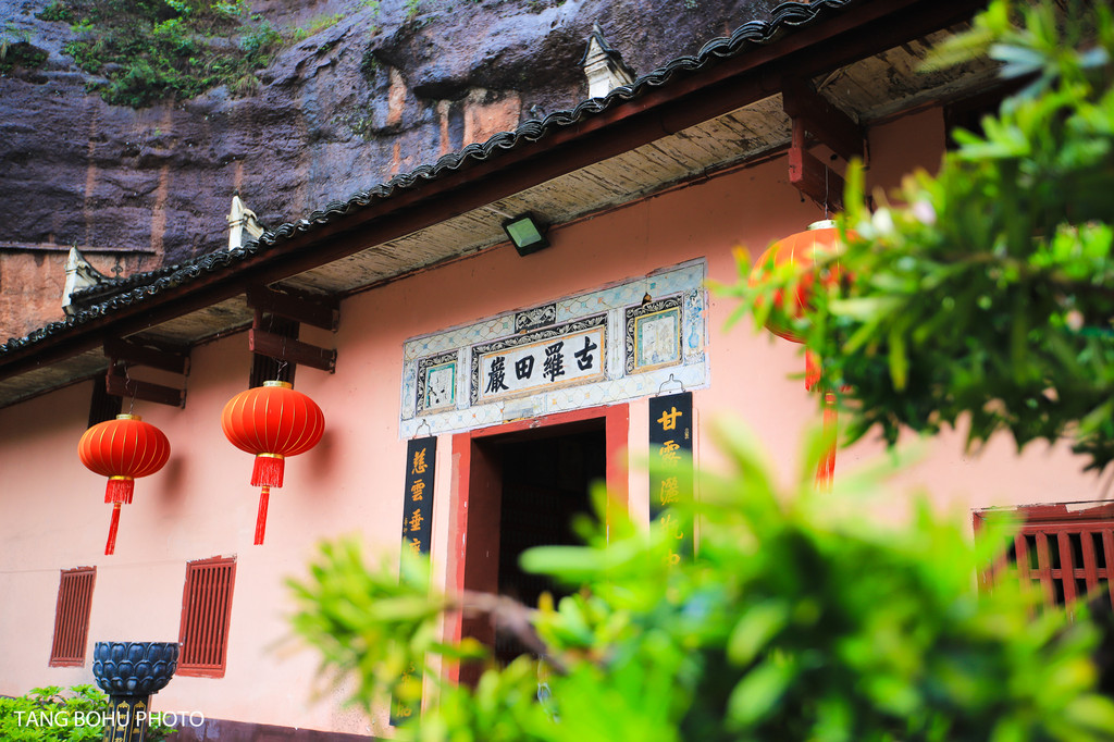 寺庙是在岩石下面,门前的许愿树上面挂满了许愿红条,山中寺阁傍岩而设,以洞为室,玲珑别致,自成风趣,非常独特的寺庙。