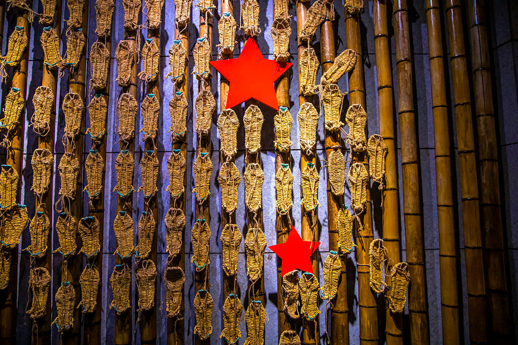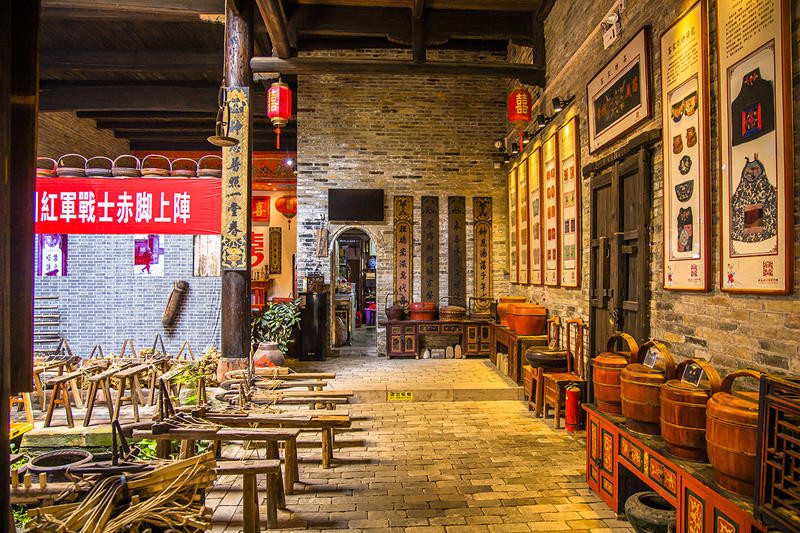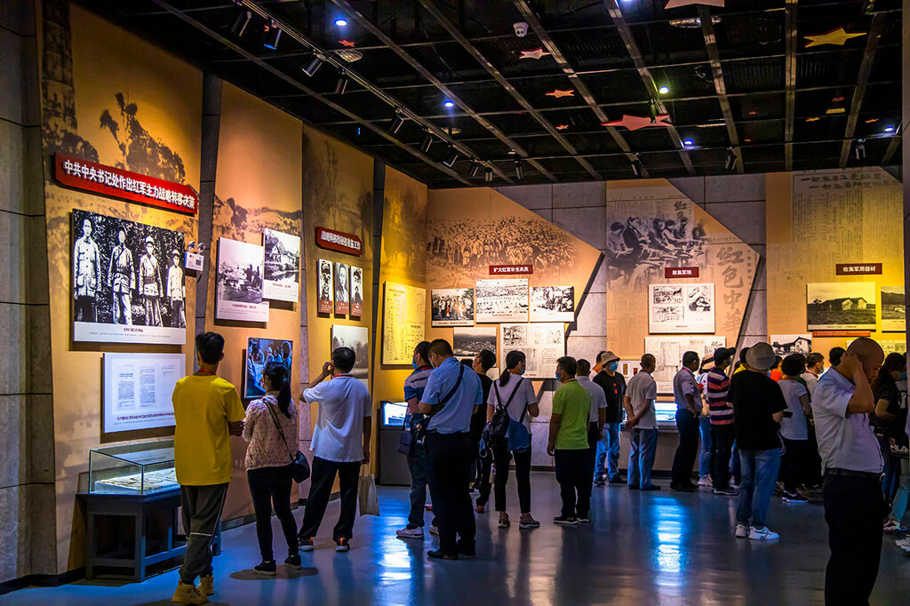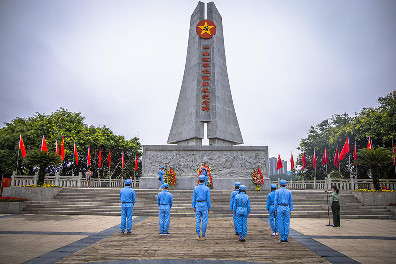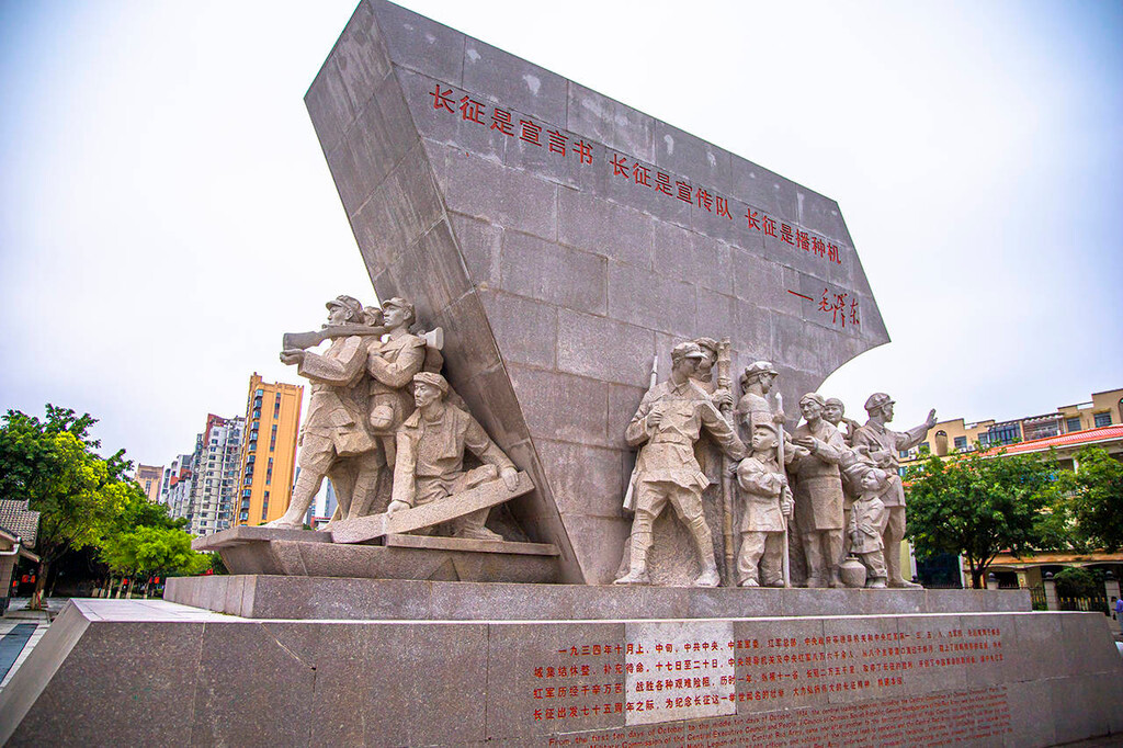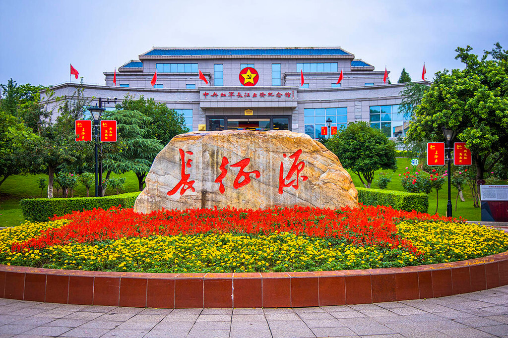 我们围席而坐,通过食物感受于都红色文化的精髓,这是以”红军长征路”启程的文化之旅这是以“新长征宴”带来的味觉盛宴,一菜一故事,品长征故事,享于都美食。 故事从80多年前说起,红军从于都集结出发,开始万里长征第一步。为帮助红军顺利渡河,于都人民无私奉献,扩红参军、借谷征粮、派丁调夫、捐木架桥,倾尽全力。离别总是伤感,于都人民手捧着什锦盒头(卷子、花生、豆子、云片、辫酥等),端着南瓜汤、客家茶送红军亲人走上浮桥,盼望亲人早日回家。 军民鱼水情、苏区“二合一”,是红军和于都人民交付生命的信任和血浓于水的情谊 利村牛肉,源于于都县利村乡。和我们平常吃到的牛肉不一样,这里是用麦叶炒牛肉,麦叶清脆牛肉鲜嫩,荤素搭配味道鲜美,利村牛肉的做法和名气在赣南十八县都很出名。沙心米冻采用于都富硒大米制作而成,沙心米冻放入红椒葱花酱汁翻炒,吃起来口感香糯Q弹,香辣十足。 超爱吃的养生二脚黄,养生土线鸡,食材选自于都岭背镇扶贫产业肉鸡养殖。肉中含丰富蛋白质、氨基酸和微量元素,营养价值高,是真正绿色无污染的健康食物。吃起来非常鲜美,回味无穷! 这一道菜看起来很像是扣肉,万万没想到的是其实是冬瓜做成的,不管是从外表看上去特别像外,我品尝了一口,味道还真的有一点带肉的味道也味道特别好。当红军历尽无数难,取得二万五干里长征的伟大胜利后,终于迎来幸福大团圆;苦尽甘来,人民的生活过的来好,酒醉肉、利村牛肉慢慢成为了家常菜。 雩河鱼干河鱼晒制成干粮,承载妻子对丈夫的依依不舍之情,长征野菜,忆苦思甜、不忘初心。在这里吃新长征宴每一道菜都有一个故事,一边吃饭一边听着服务员给我们讲菜的故事,这对于第一次来到于都的游客,在通过抵达于都第一顿晚餐便更了解了这里。 【夜游新长征广场,观看一场水幕电影】 品味过长征美食后,大家便一同前往新长征广场,观看一场水幕电影,在声,光,电和水幕的搭配之下,感受一场艺术的盛宴。 在中央红军长征出发地纪念园新长征广场,每周五、周六晚上可以观看到大型红色水幕电影。随着一阵悠扬的音乐,广场正前方的喷泉上随着水幕的喷出,一幅幅色彩鲜艳的图像出现在半空中,水雾电影中介绍了众多于都红色的感人事迹,这些造型各异的图案旋转着、飞舞着,像一个个灵动的精灵,观看的人群中不时爆发出欢呼声和掌声。 静水流深,心潮澎湃。在中国地图上,于都河只是一条普通的河流。但在我们心灵的版图里,它水远都是探寻“初心”的源头 于都是中央红军长征集结出发地,长征犹如一座丰碑,光辉地立在了中华民族复兴的伟大史册中。 🕙大型红色水幕电影放映时间:每周五周六周日晚20:00,21:00各一场(下雨天除外); 演出地点:中央红军长征集结出发地纪念园新长征广场。 于都长征源湿地公园,是一处省级湿地公园,位于于都河河畔。慢走在湿地公园内还能发现不少的小红军雕像尽显于都红色基因。 【中央红军长征集结出发地纪念园 长征起点初心之旅】 中央红军长征出发地纪念园,长征起点初心之旅 江西是著名革命老区,也是中国革命的摇篮,更在中国工农红军长征历史上扮演着重要角色。我们一行人身着军装来此追寻红色足迹,探访中央红军长征出发地纪念园,向中央红军长征出发纪念碑敬献花篮,并参观中央红军长征出发地纪念园。寻访长征的历史故事,感受长征路上的红色精神魅力。 中央红军长征出发地纪念园位于全国重点文物保护单位——中央红军长征出发地旧址于都县城东门渡口。纪念园由送别主题雕塑、集结广场、东门渡口旧址、中央红军长征出发纪念馆等纪念设施组成。当年中央红军渡过的那条于都河,也在纪念园旁缓缓流淌。 来到纪念园,一定要去中央红军长征出发地纪念馆参观学习。纪念馆展厅有两层,陈列是采用文字、图表、照片、声、光、电等现代化手段,直观展示中央红军出发长征的历史,再现中国革命伟大转折及苏区人民支援红军的历史场景,是目前全国唯一一处了解中央红军长征出发历史的主题性纪念馆。 整个展厅图文并茂、生动记载了英勇的工农红军非凡的智慧和勇气,以百折不挠的革命精神和所向无敌的英雄气概,并最终取得长征胜利的伟大壮举。 在中央红军长征出发纪念馆内一副由80双草鞋组成的中国地图,十分引人注目。小红五星代表了江西于都,大红五星代表首都北京。中央红军当年就是穿着这样的草鞋,一走走了两万五千里,走出了中国革命的新局面。 参观后,大家都感动于老一辈革命者艰苦卓绝的斗争精神,并从中汲取到红色基因传承的力量。 红军的长征,不仅是一次杰出的军事成就,还是一次具有深远影响的政治运动。纪念园先后被中宣部公布为“全国爱国主义教育示范基地”、国务院公布为“全国重点文物保护单位”、团中央公布为“全国青少年教育基地”、国家旅游局公布为“国家三A级旅游景区”。 如今,中央红军长征出发地纪念园已成为弘扬长征精神、开展爱国主义教育的重要场所,并已列入全国30条红色旅游精品线。 地址:赣州市于都县于都县贡江镇 门票:免费开放 开放时间:全天 周边公交信息:于都2路、于都5路 【红四军军部旧址葛氏宗祠,长征源民俗博物馆】 江西于都•『长征源民俗博物馆』 一座革命遗址:葛氏宗祠,也是红四军军部旧址。如今是赣南