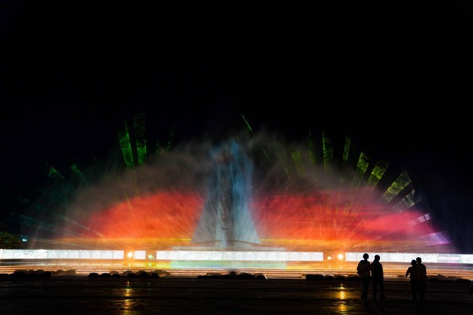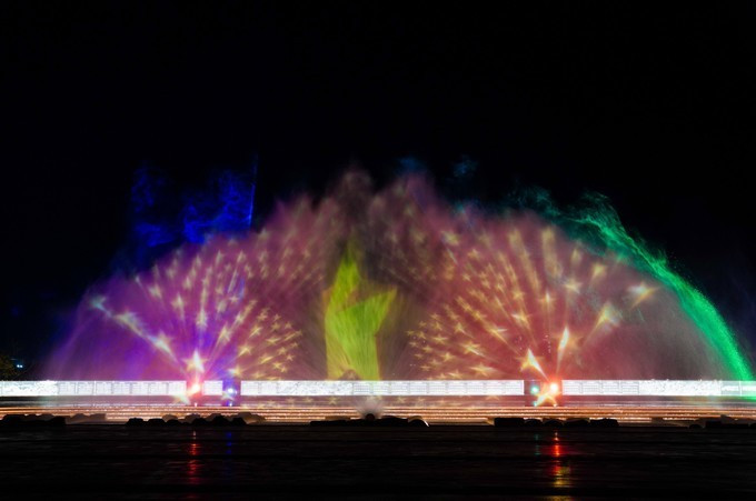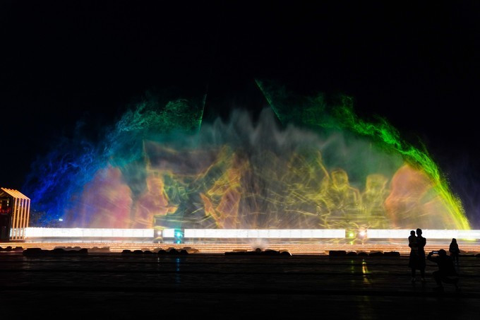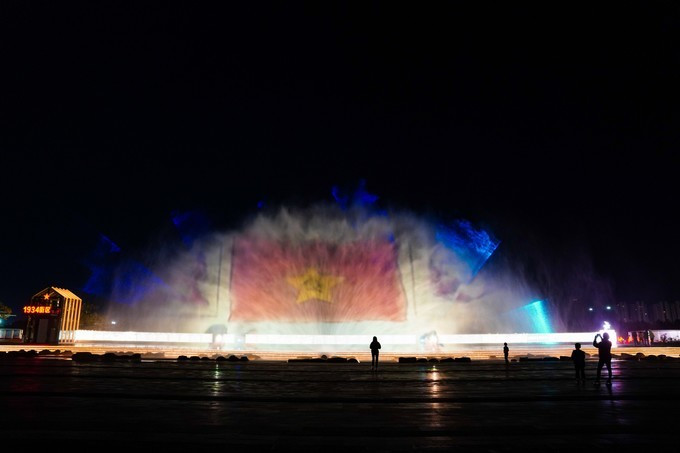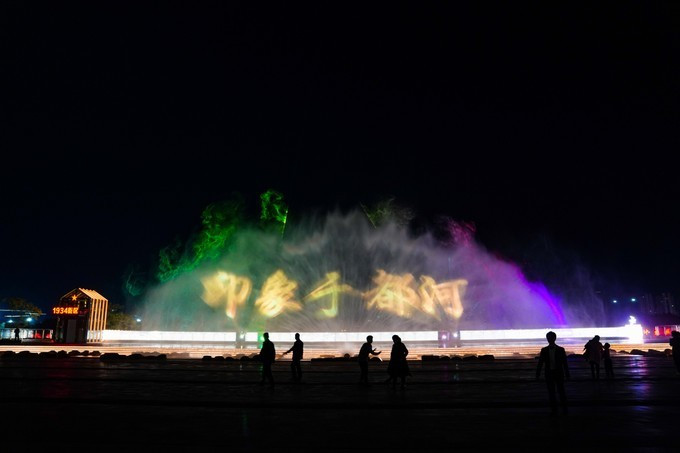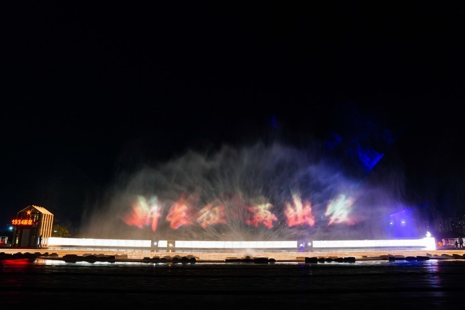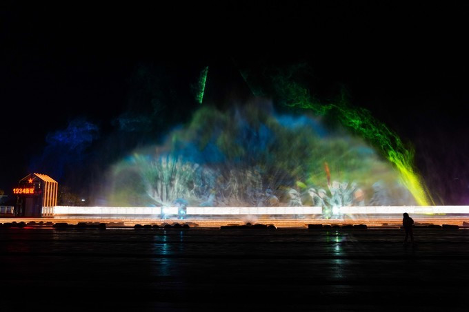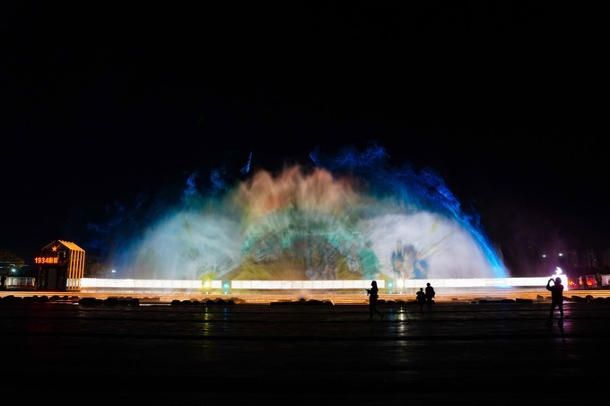 随着一阵悠扬的音乐,广场正前方的喷泉上随着水幕的喷出,一幅幅色彩鲜艳的图像出现在半空中,那些长征时期的故事,逐一浮现在光影变幻的水幕之上,仿佛让人穿越到了那个年代,眼前的每一幕画面无不让人动容。