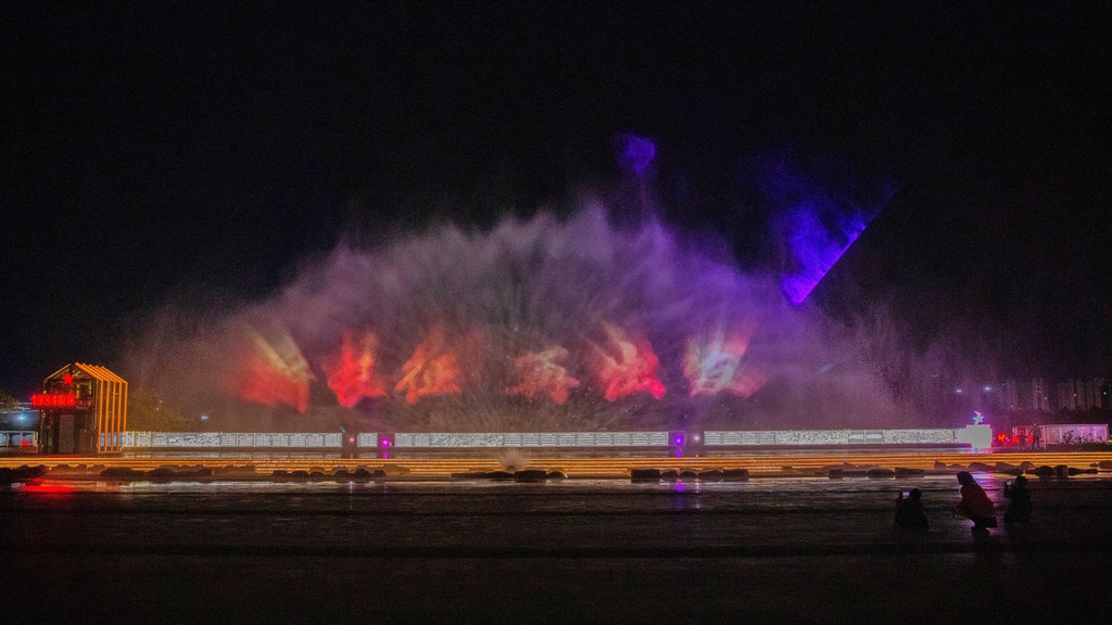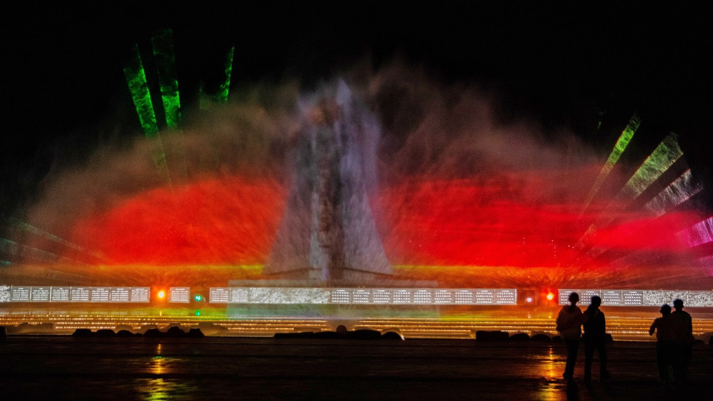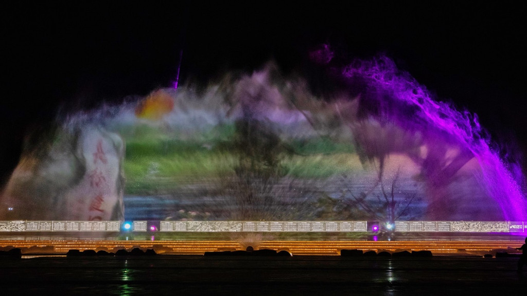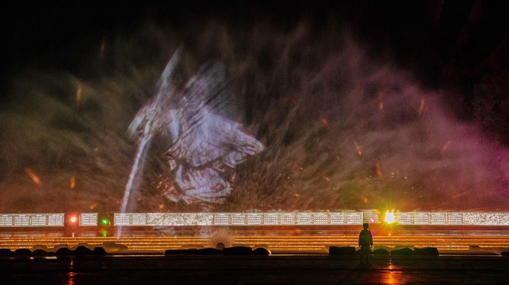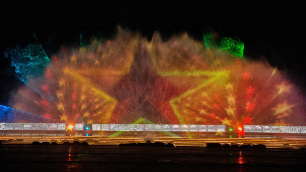 入夜十分,纪念园的新长征广场上,每周末晚,都会免费上演大型红色水幕电影,介绍当年红军长征的感人故事。一件件,一桩桩往事,无不令人动容。