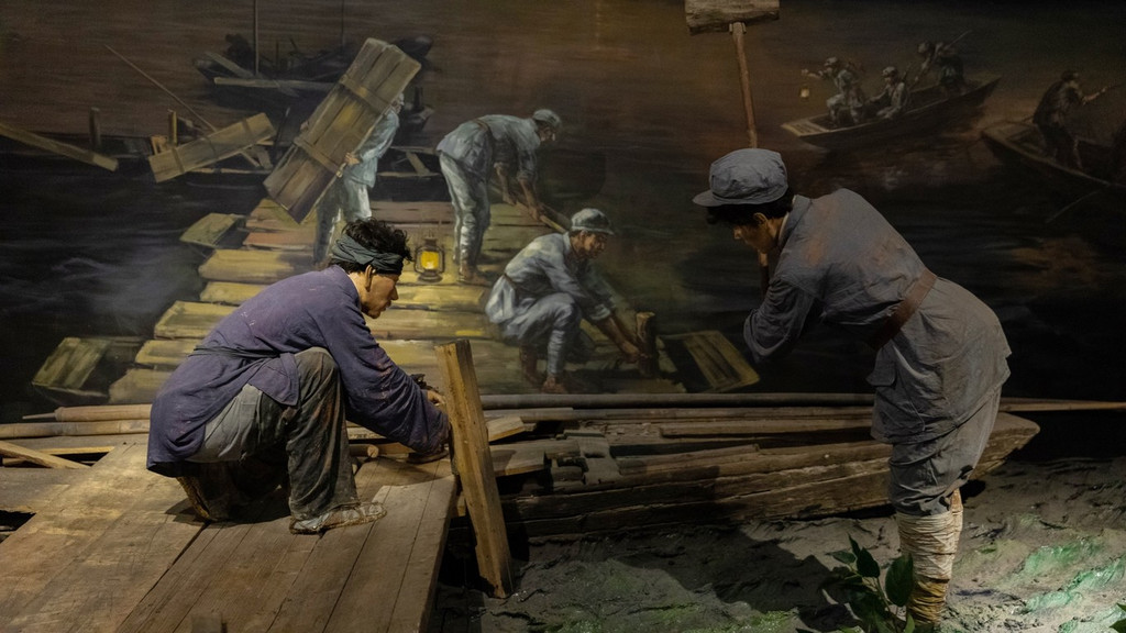 在纪念馆内,还有一组后期复原的红军渡河时的场景,展现了当年的军民鱼水情。当年,中央红军渡 于都 河时,河上没有桥,大部队要过河就只有架设浮桥。