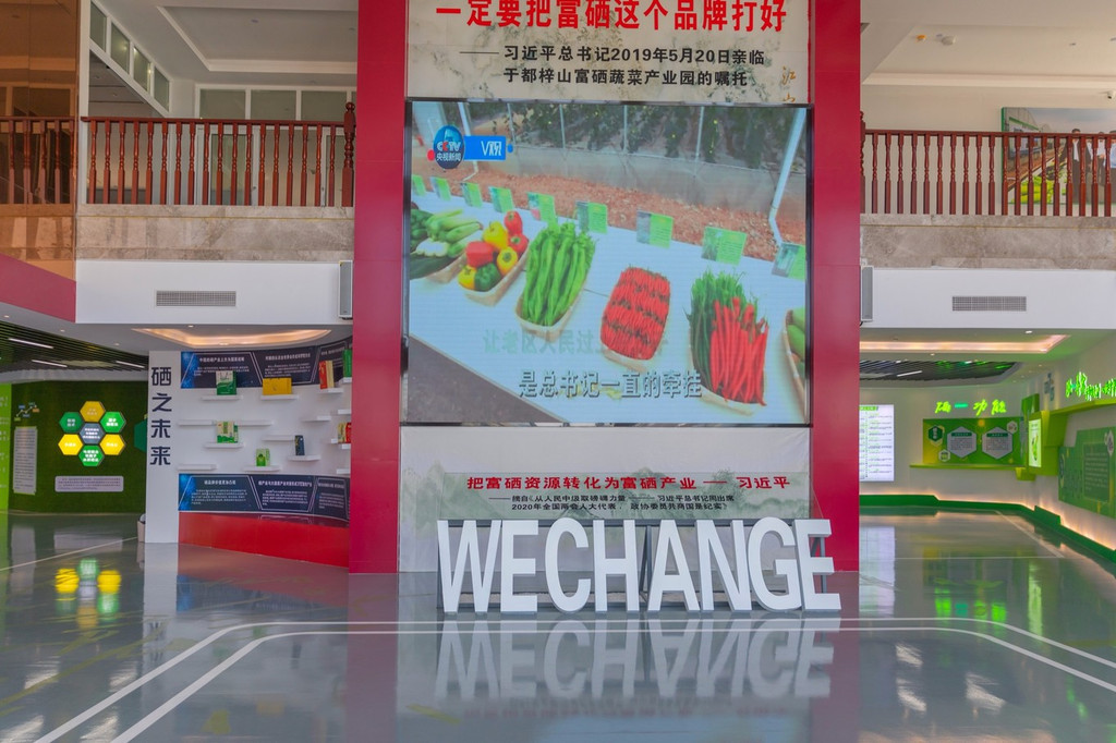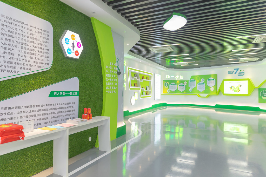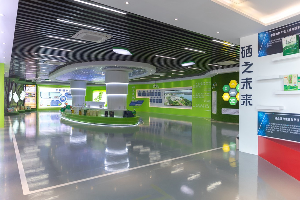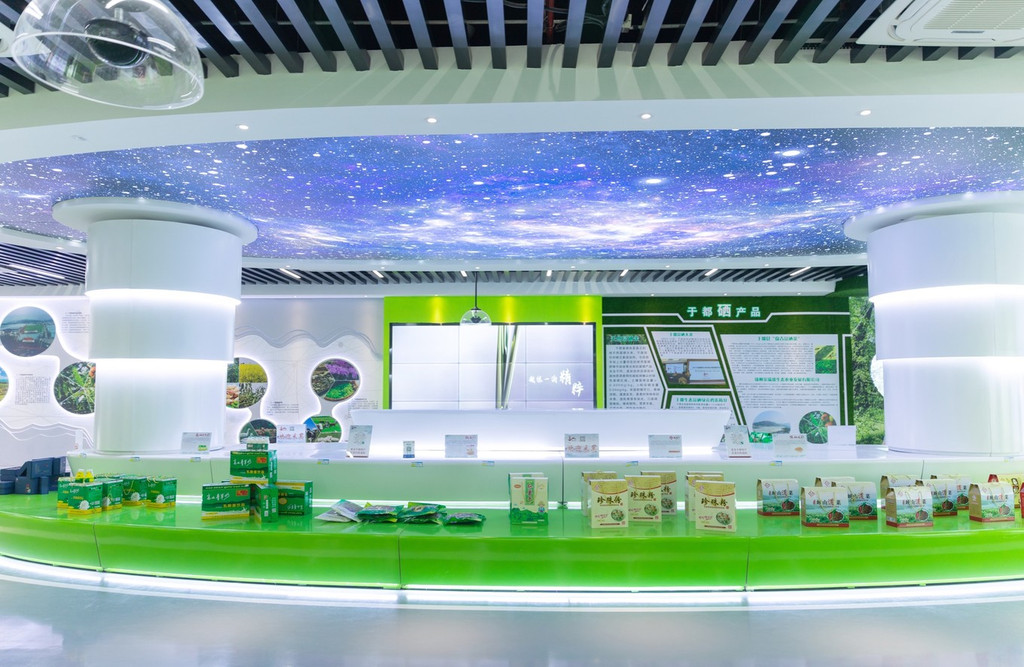 于都 硒博馆建设面积约为1200多平米,主要分为接待大厅、展示区、硒讲堂、硒直播间四个区域。展示了 于都 当地各种特产,以及含硒的产品。