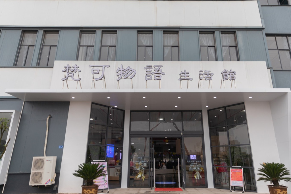 在展厅后面,是赢家服饰有限公司近20万平方米的现代化制造基地,1500名职工正在生产车间紧张工作;基地还设有幼儿园、超市、食堂、电影院、KTV、篮球场、羽毛球场及员工培训大学等。