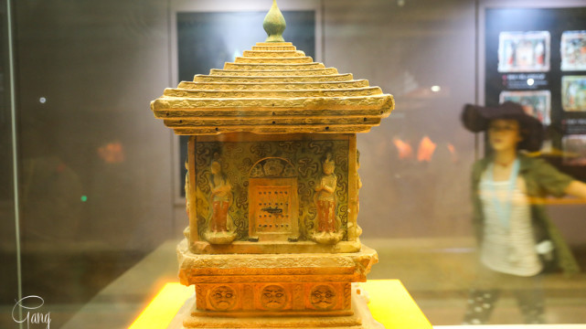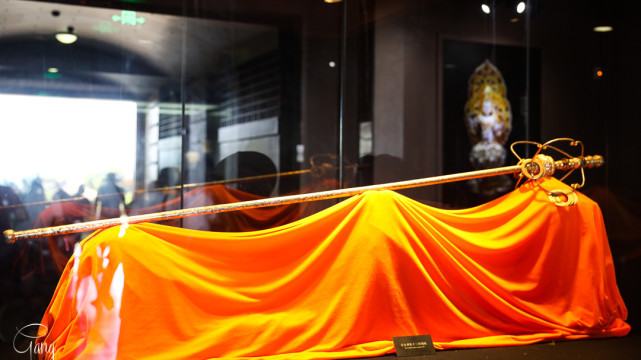 馆内主体建筑--珍宝阁里是仿照地宫出土的唐代鎏金铜浮屠的式样建造,高大宏伟,别具一格,与寺院真身舍利宝塔相辉映,唐代鎏金银龟盒和鎏金双拢12环锡杖造型优美,金光闪烁,把我们的目光带回了大唐盛世,也引领我们进入法门寺珍宝馆。