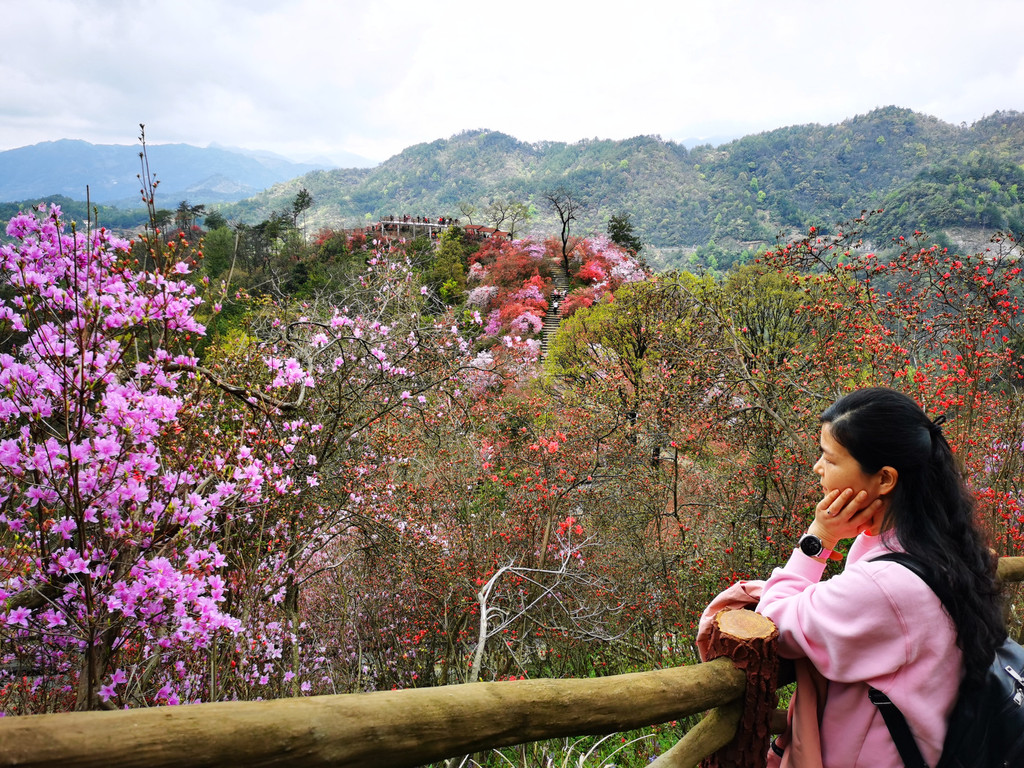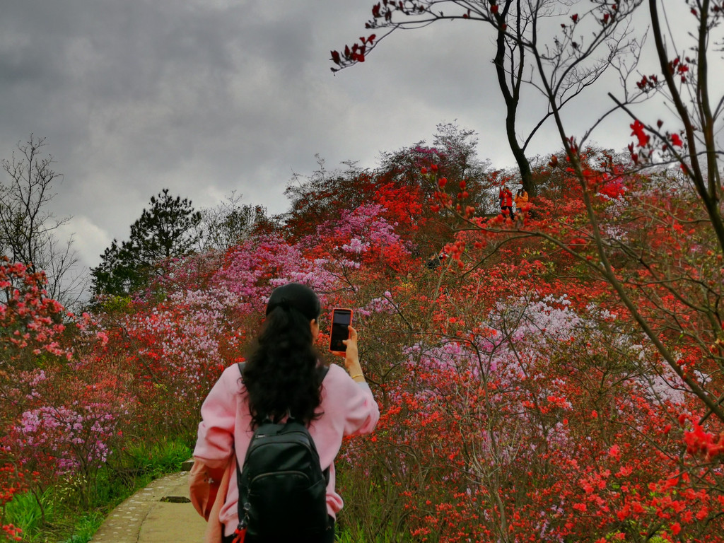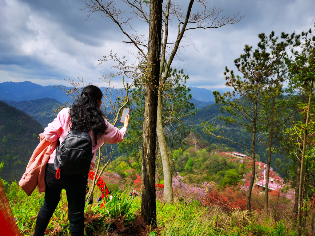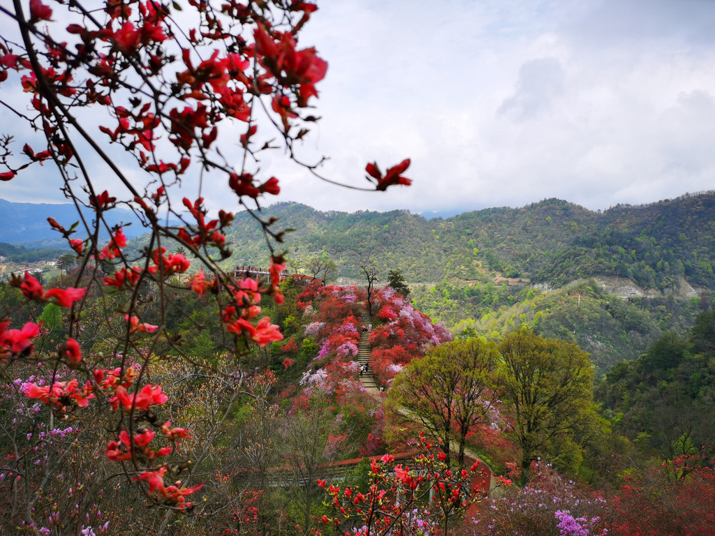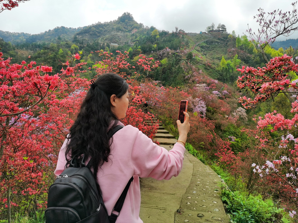 盛放的杜鹃花犹如为大山披上了盛装,又好似为山林涂了胭脂,远远望去,绚烂如云如梦如幻,如诗如画。