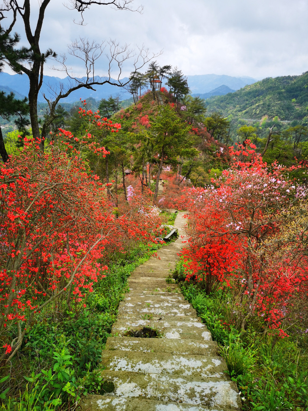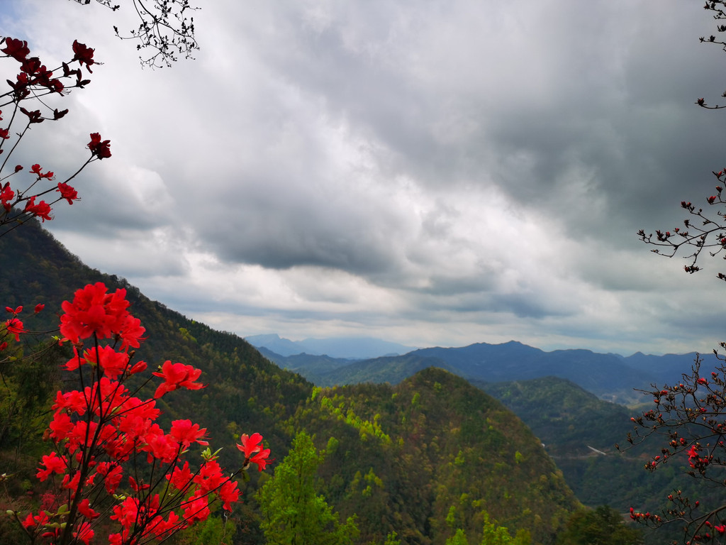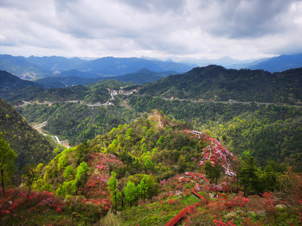 平台上俯拍杜鹃花海;杜鹃花是中国十大传统名花之一,也是大别山区花中皇后,多彩的杜鹃花始终闪烁于满山遍野。
