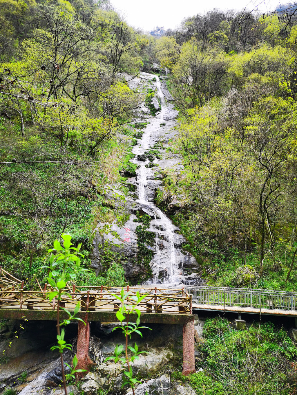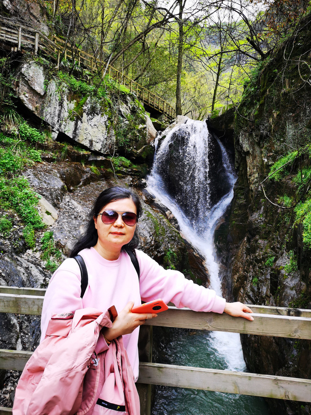 拍对面的银蛇瀑布;回程时走在瀑布下面的栈道上;