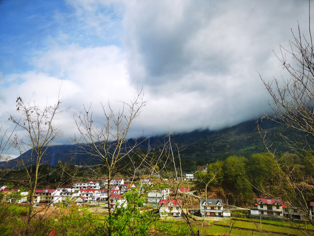 高速公路上行驶的汽车中拍摄的雨后小山村,恍若仙境;