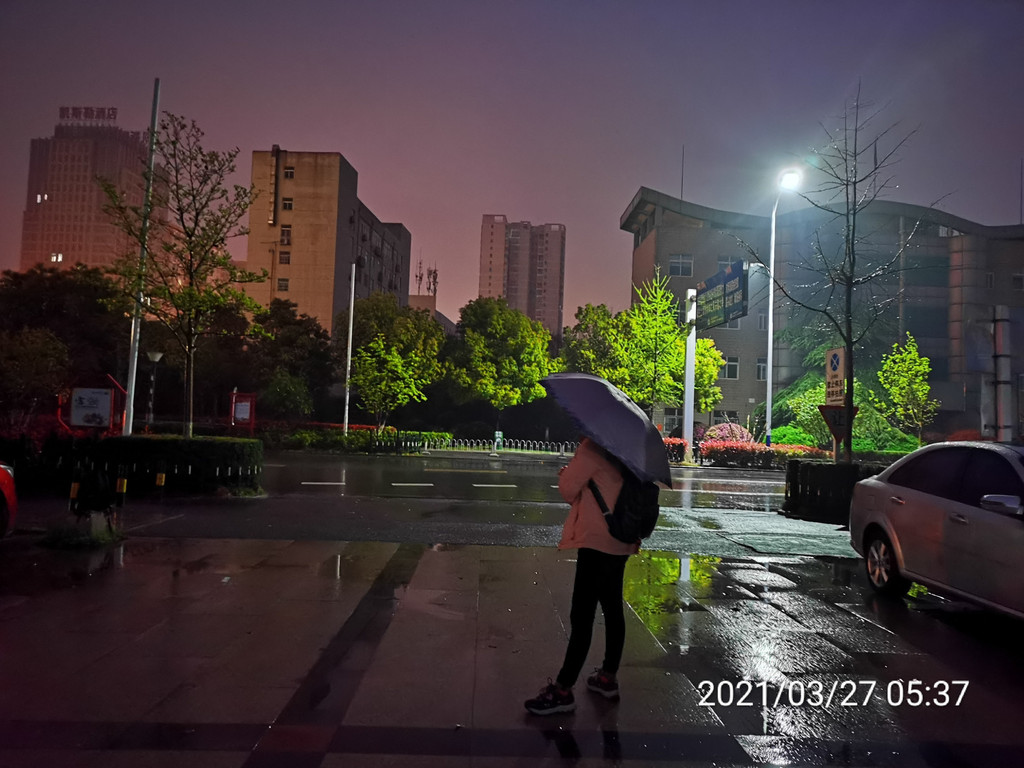 早晨小雨中等待大巴车。