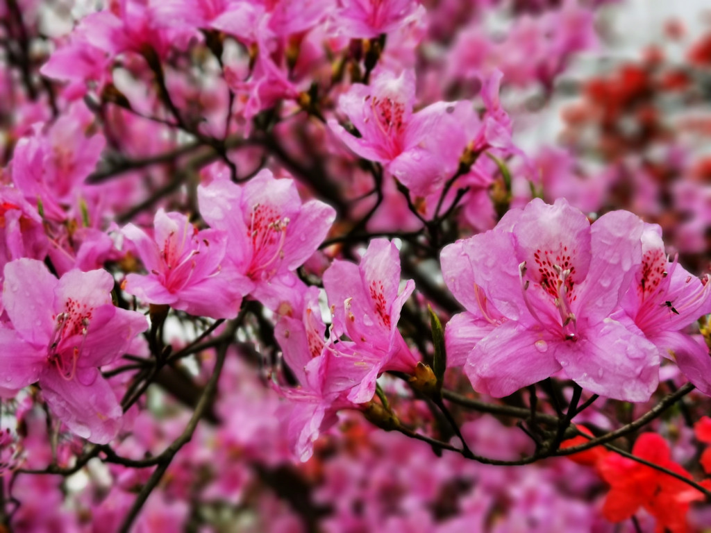 开放中的杜鹃花,水珠清晰可见;