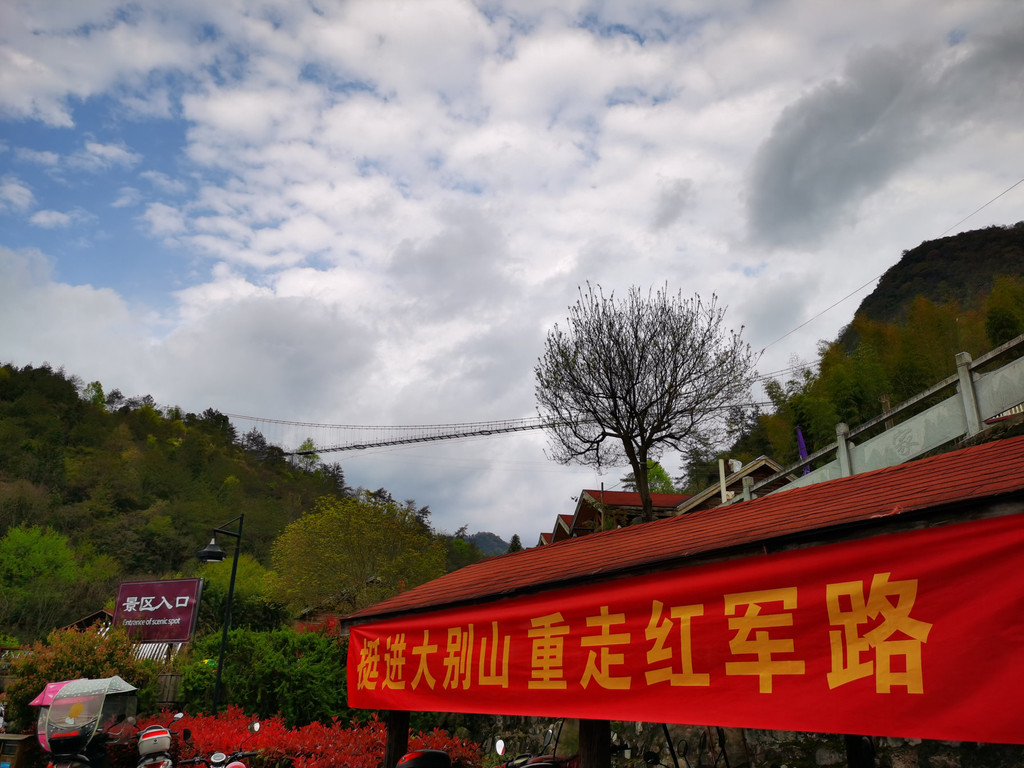 出景区大门,至此天峡一日游圆满结束,看到鲜红的横幅,诗兴大发:天峡杜鹃早闻名,翻山越岭探究竟;花团锦簇雨中挺,映山红遍红军情。