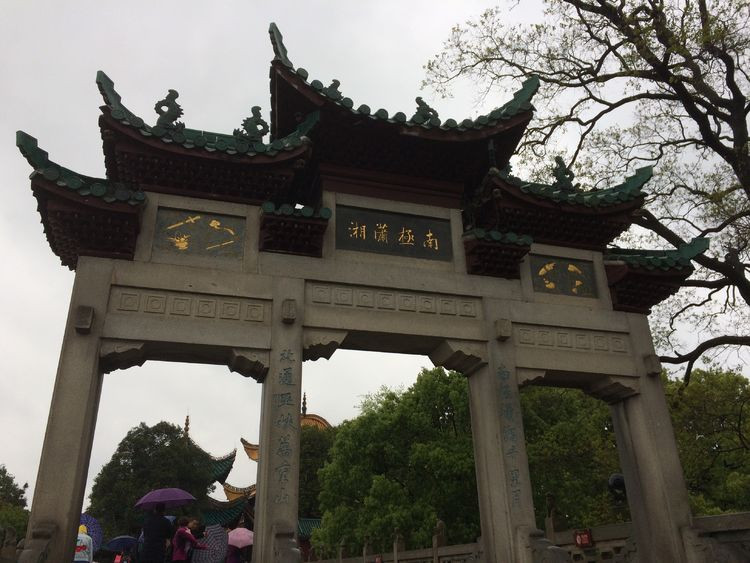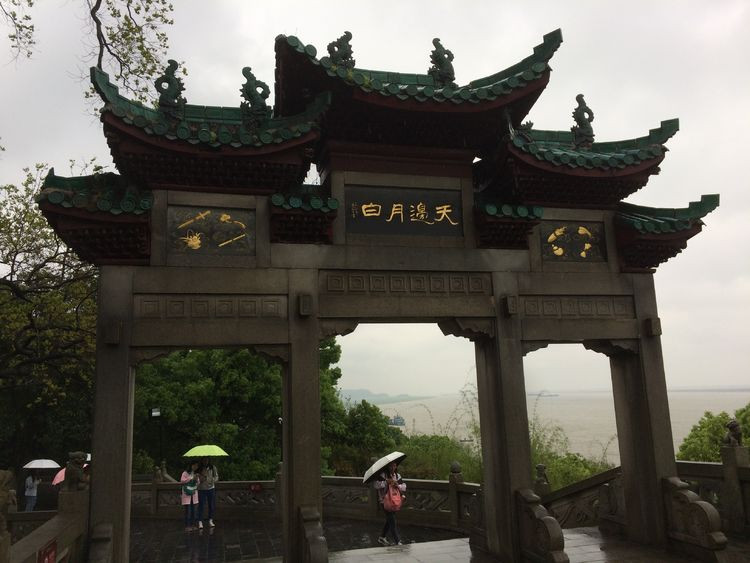 经过曲折的走廊上山辗转到了洞庭湖边,沿着台阶拾级而上,迎面是一个高大宏伟、古朴庄严的门牌楼,只见如意斗拱,琉璃瓦顶,青石横楣上书“南极潇湘”,背面刻着“天边月白”,放眼洞庭湖,湖边新竹的嫩枝高高俏立,湖面云雾笼罩,一片苍茫。