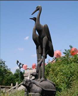 除了一楼充盈黄鹤传说的壁画,楼体正门门前广场的园坛正中,一对黄鹤伴侣峭立龟背之上的铜雕,引人注目。细看之,神龟又被长蛇缠绕,神龟和长蛇的头部面向奔腾长江远眺。这样一幅集三种动物形象而成的铜雕,查阅后方知,也是神话传说的产物。白云黄鹤壁画,对应了黄鹤返憩而后载仙人西去的神话传说,这个集黄鹤、长蛇和乌龟三位一体的铜雕,则既有黄鹤归来的寓意,也给了黄鹤楼的地缘解释。黄鹤楼耸立蛇山之巅,黄鹤伴侣站在被蛇缠绕的龟背之上,大概就是这个地缘寓意所在。蛇自然是蛇山的对应,而龟则是两水交汇之处联结大桥的龟山的对应。