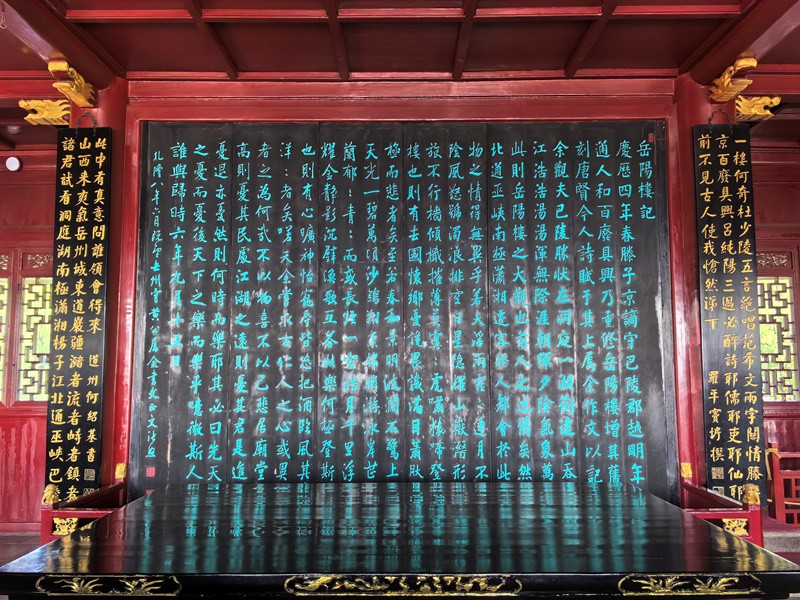 乾隆八年(1743年)岳州知府黄凝道特请大臣、大书法家张照(1691-1745年,字得天,号泾南,华亭人,康熙进士,雍正间官至刑部尚书)书写《岳阳楼记》全文,将刻于木屏之上,置于岳阳楼中。