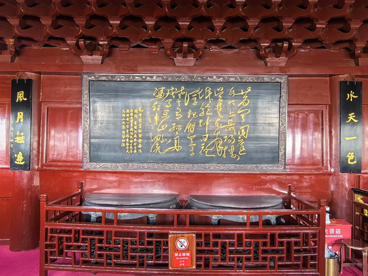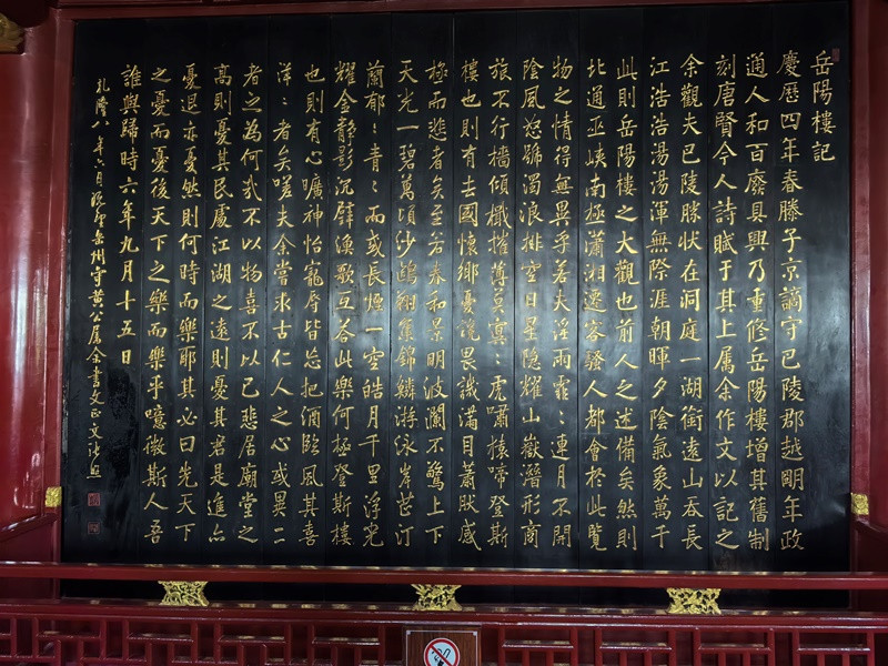 岳阳楼内的文化,下图是两块相似的刻有《岳阳楼记》的木屏,一块置于一楼,一块置于二楼。同一座楼,何必嵌立两幅同文雕屏?