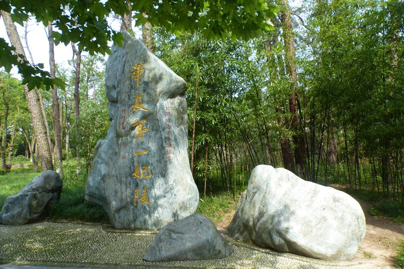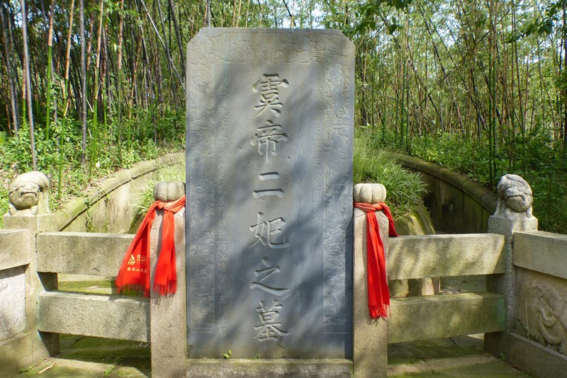 二妃突闻噩耗,投水殉情,葬于君山。虞帝(即舜帝,舜为四部落联盟首领,以受尧的“禅让”而称帝于天下,其国号为“有虞”,故号为“有虞氏帝舜”)二妃墓是娥皇、女英的合葬墓,是中国古代最早的妃子墓,故称华夏第一妃陵。二妃墓前立有大书“虞帝二妃之墓”的墓碑。