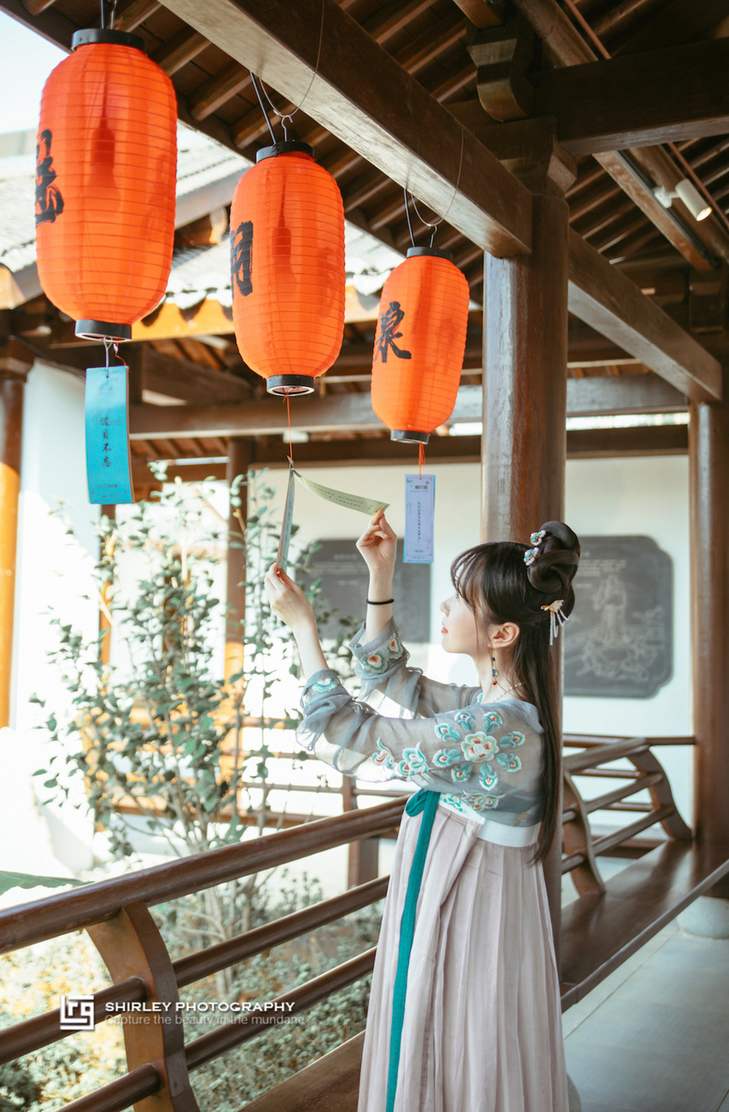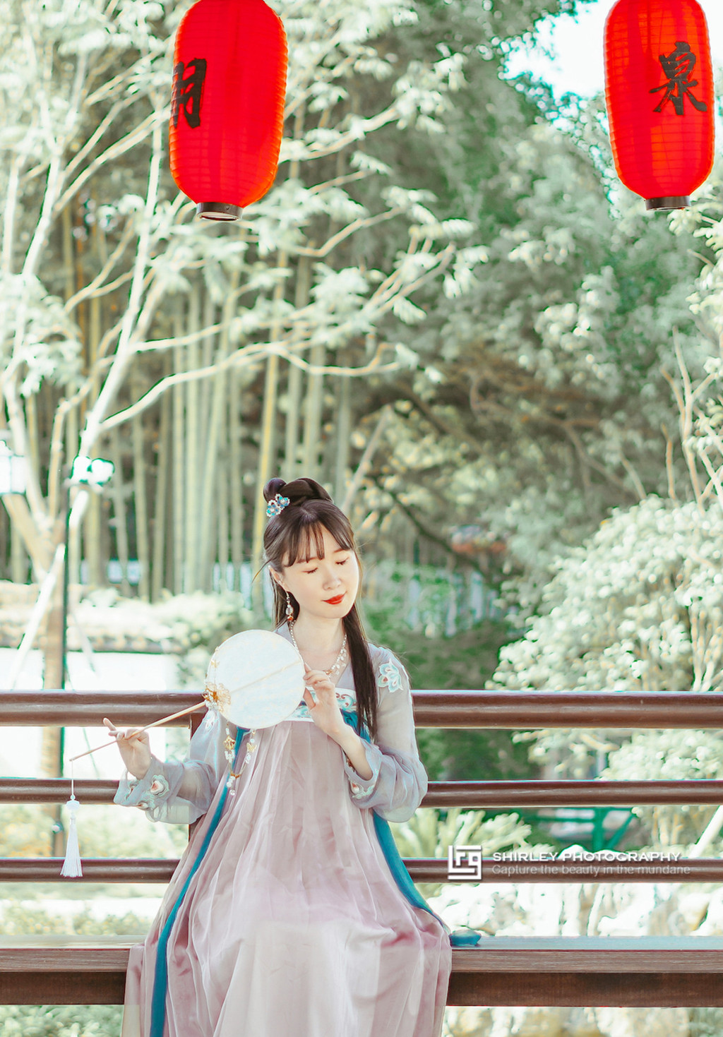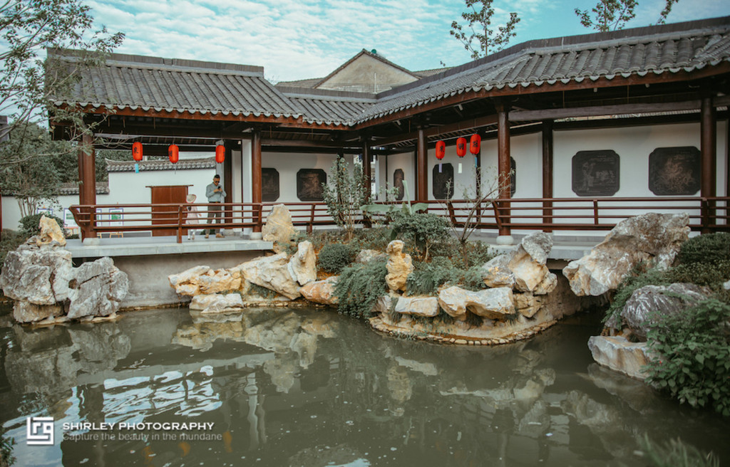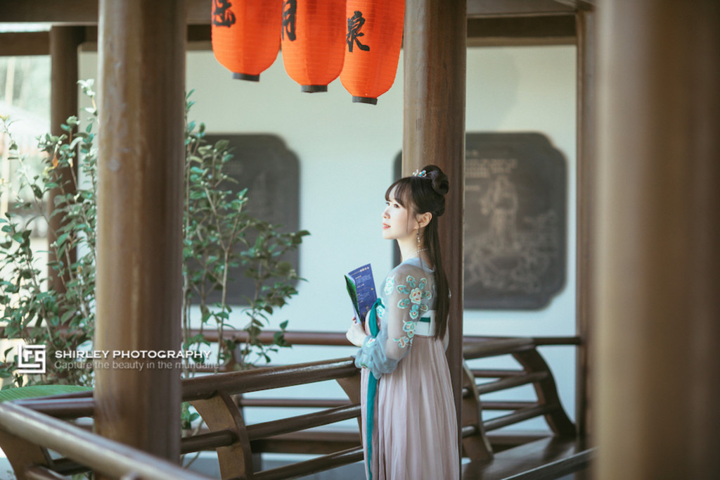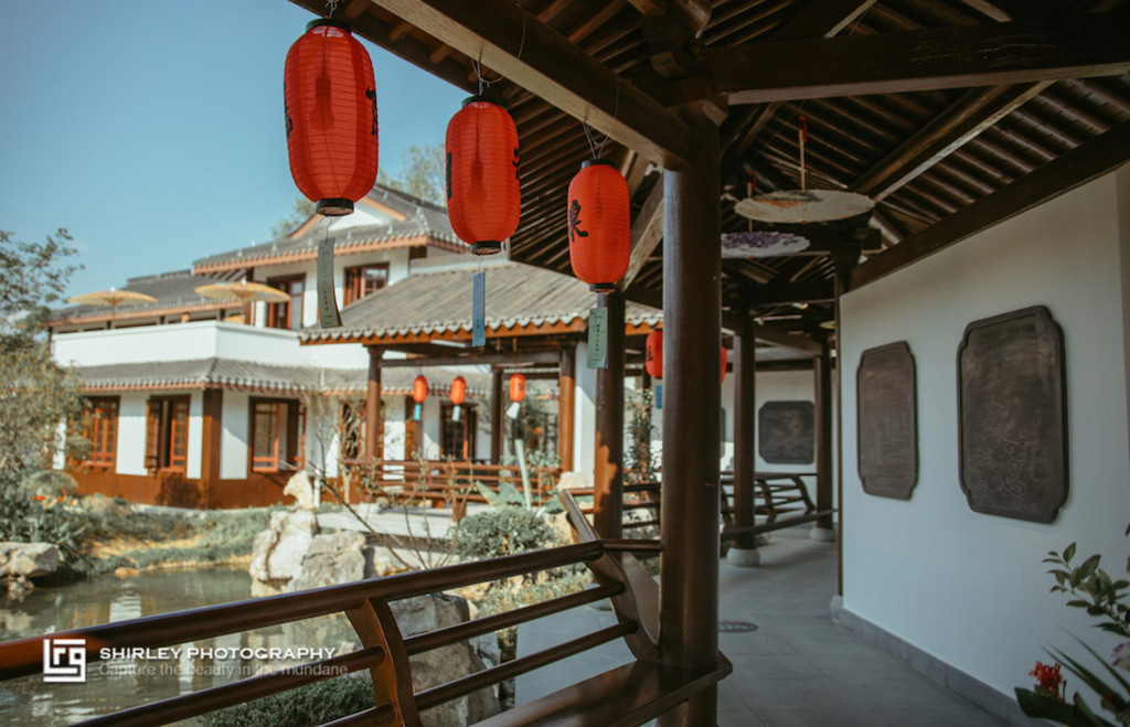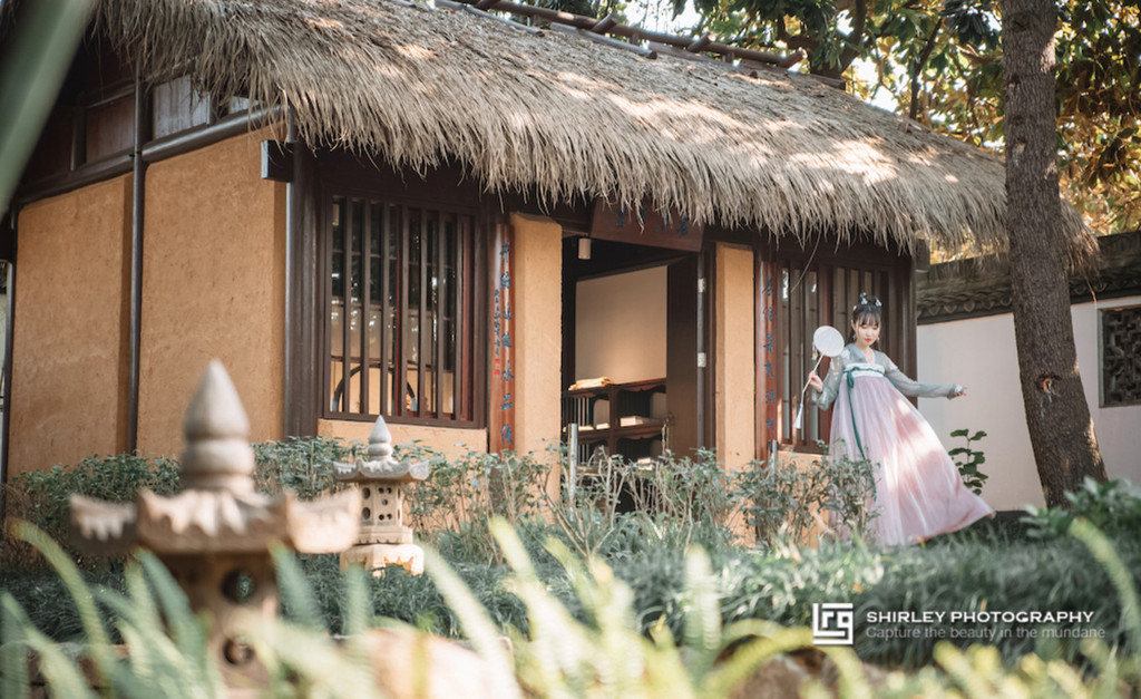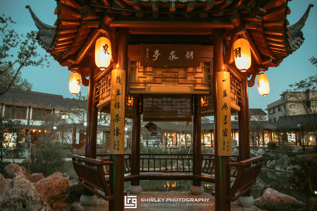 因为是古风园林,有许多穿汉服可以拍摄的场景, 比如 屋檐下的美人靠,漏窗,拱门,凉亭等等;带上些古风道具,在这里可以拍上一整天。 比如 眼前这蜿蜒曲折的回廊,上方还摇曳着点缀陆羽泉三字的定制红灯笼,是我们最爱拍的场景啦!