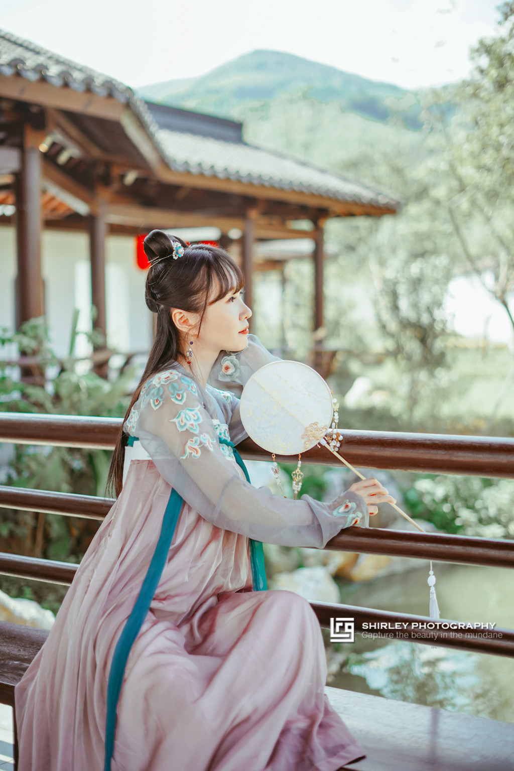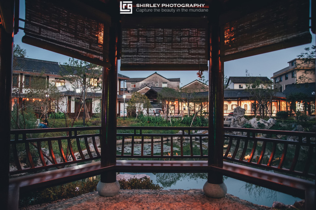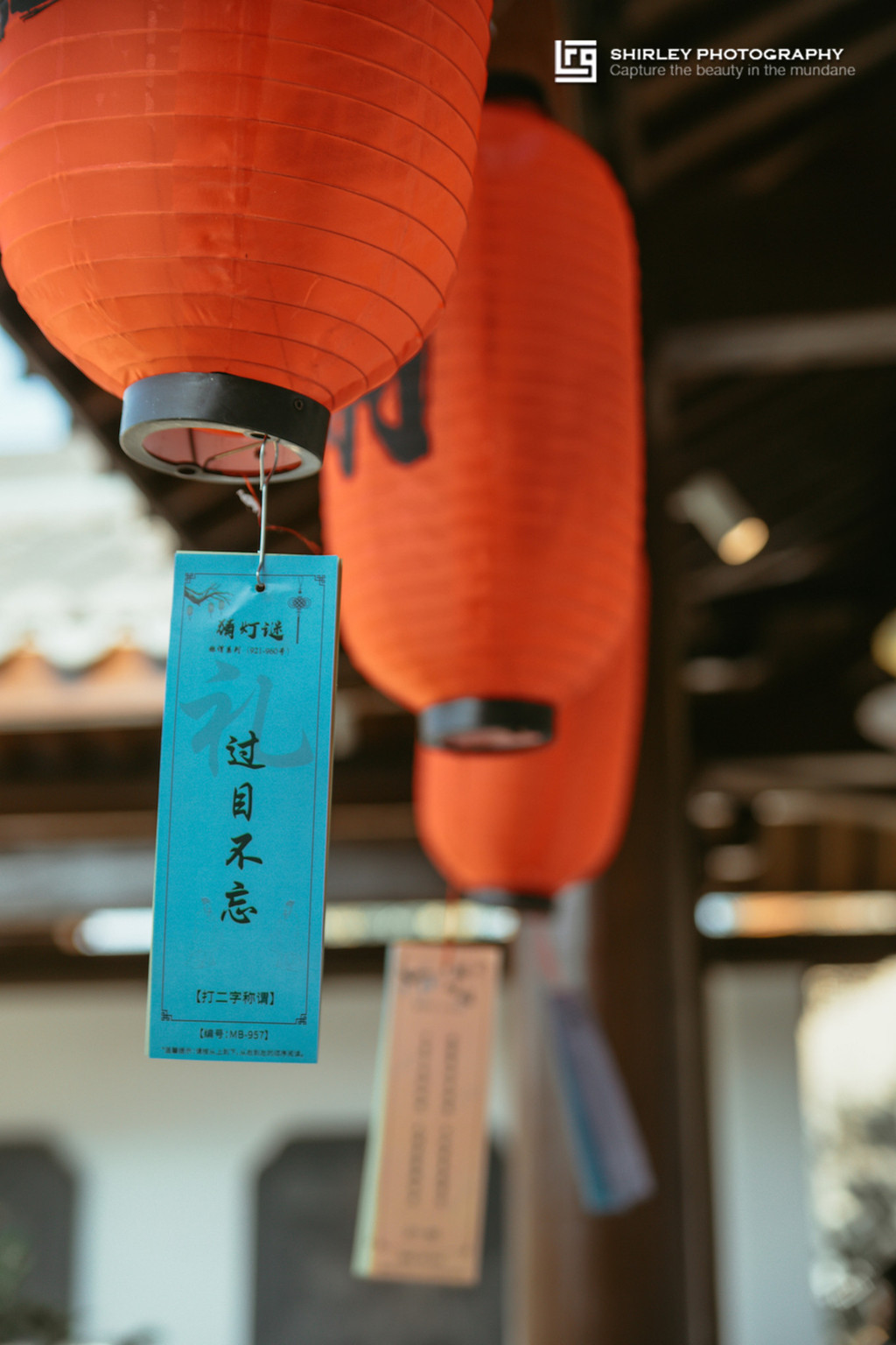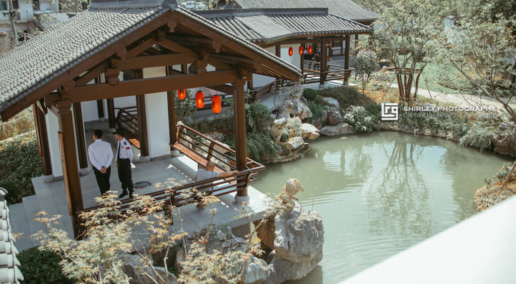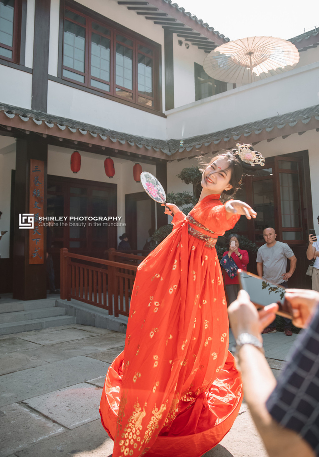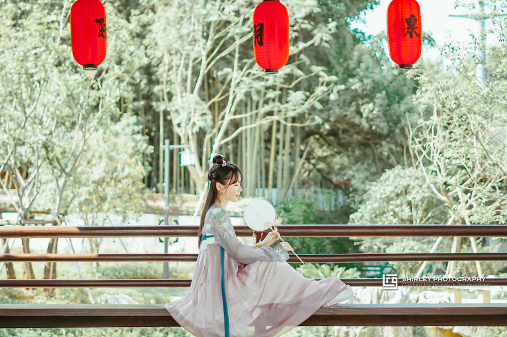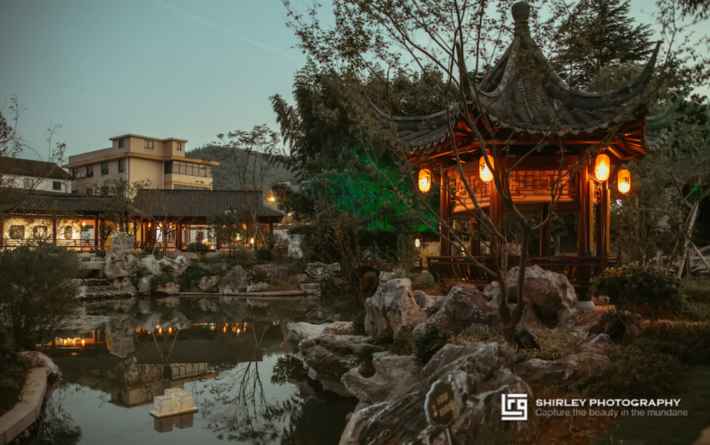 因为是古风园林,有许多穿汉服可以拍摄的场景, 比如 屋檐下的美人靠,漏窗,拱门,凉亭等等;带上些古风道具,在这里可以拍上一整天。 比如 眼前这蜿蜒曲折的回廊,上方还摇曳着点缀陆羽泉三字的定制红灯笼,是我们最爱拍的场景啦!