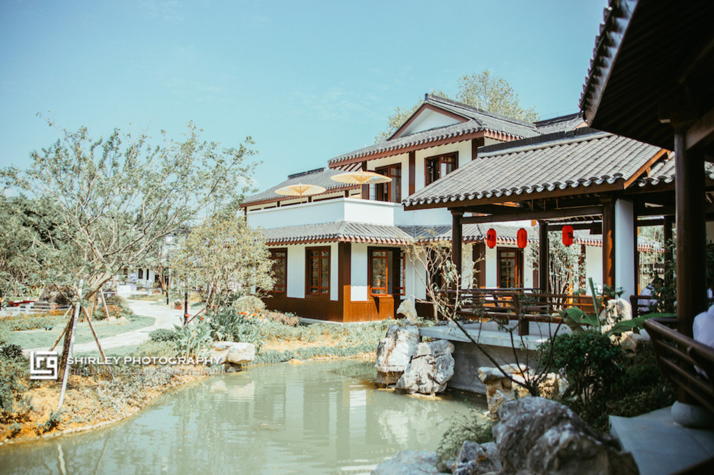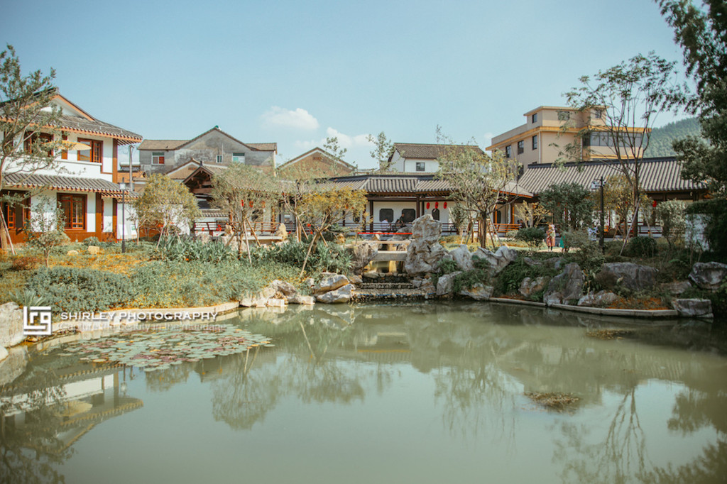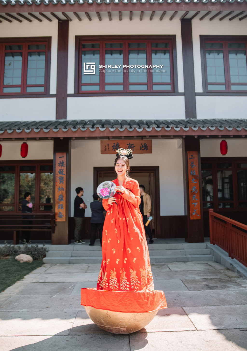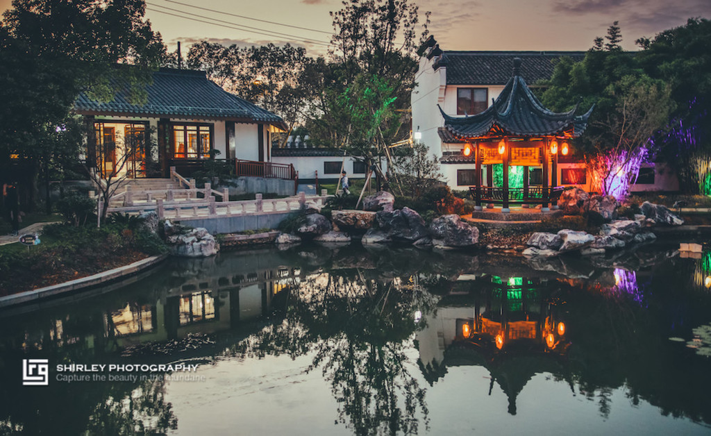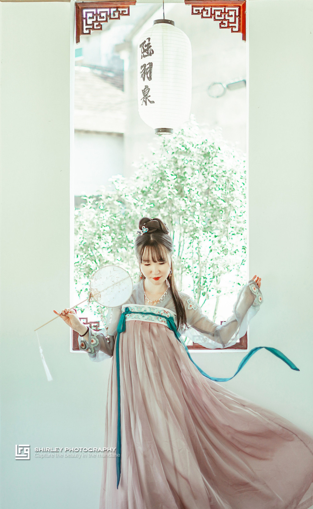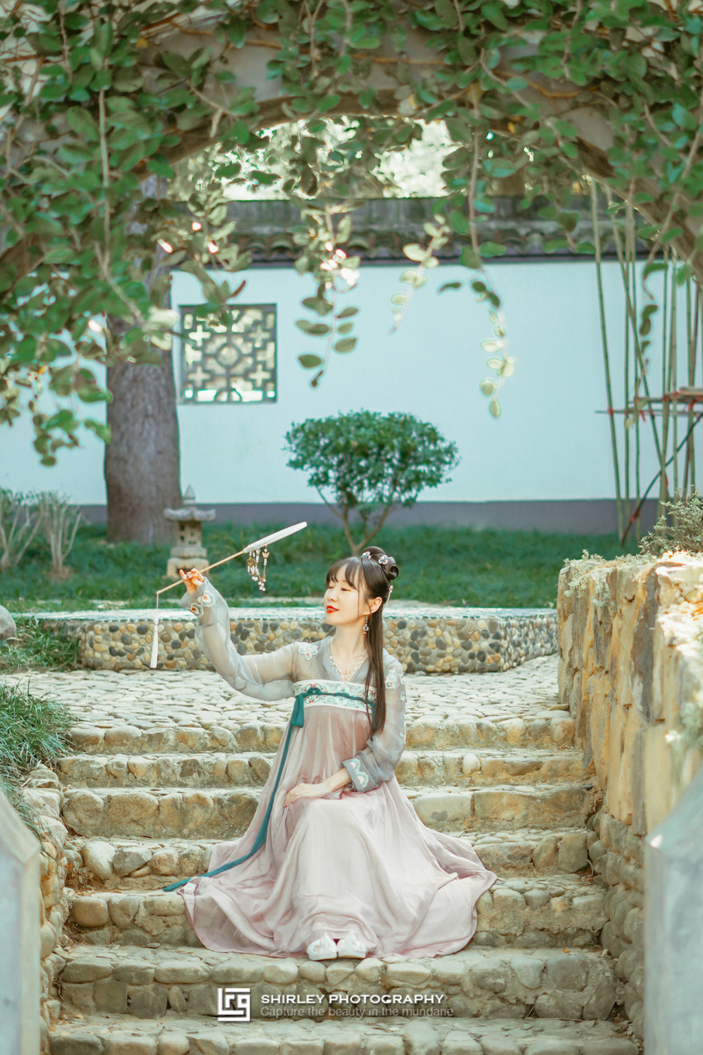 因为是古风园林,有许多穿汉服可以拍摄的场景, 比如 屋檐下的美人靠,漏窗,拱门,凉亭等等;带上些古风道具,在这里可以拍上一整天。 比如 眼前这蜿蜒曲折的回廊,上方还摇曳着点缀陆羽泉三字的定制红灯笼,是我们最爱拍的场景啦!