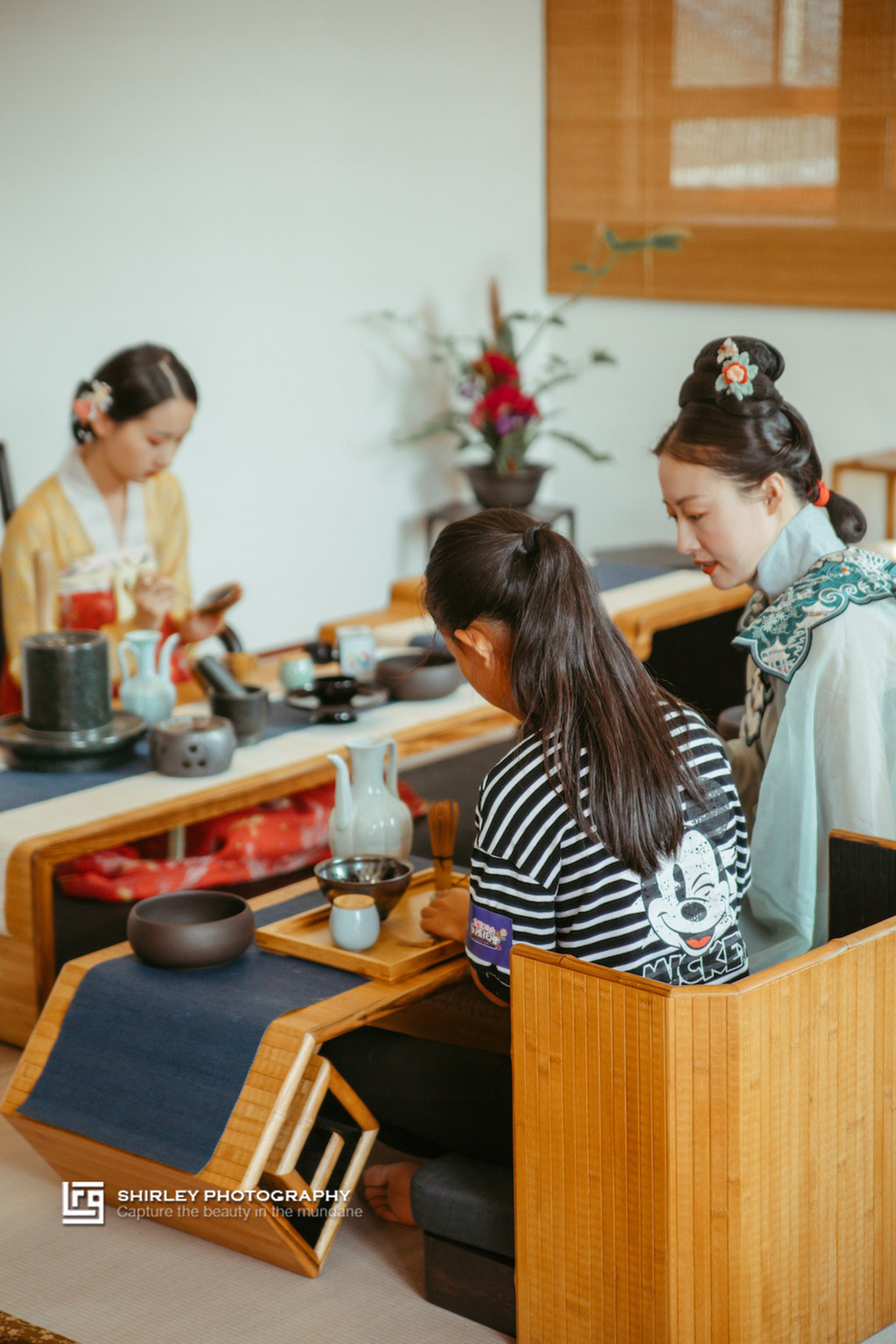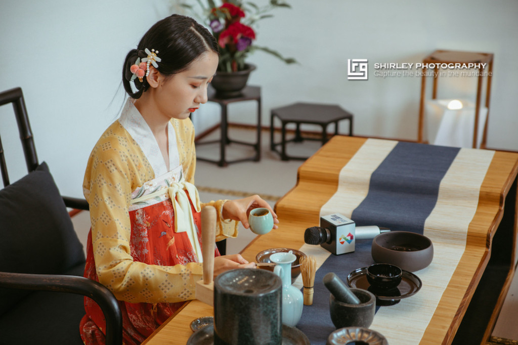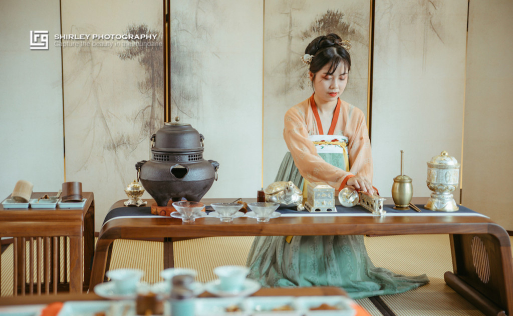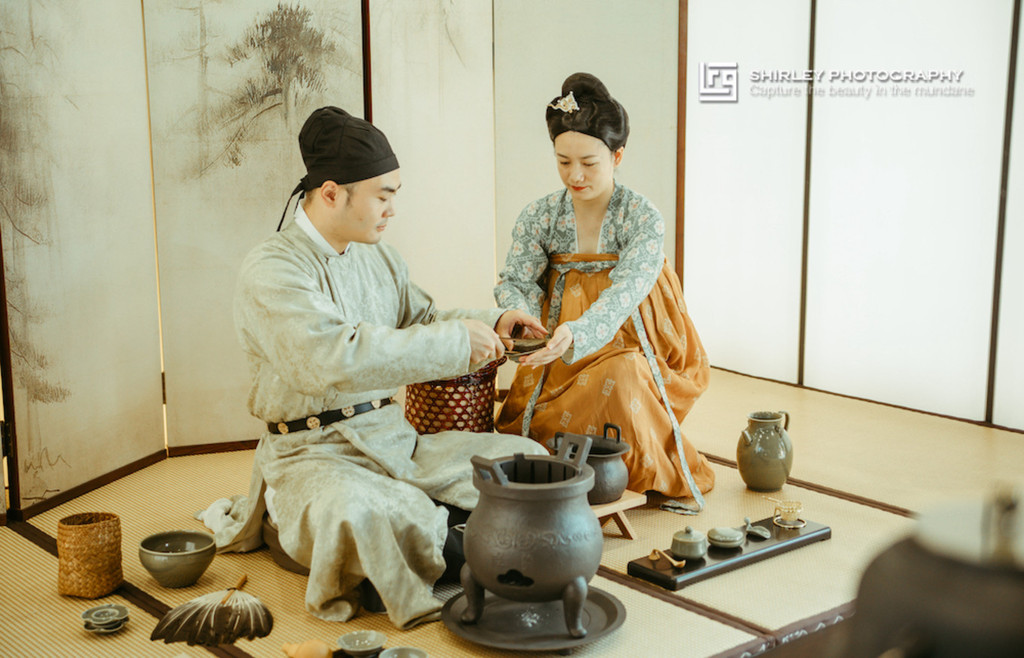 当天为所有人表演的两位茶艺师,已坐在山水屏风围绕的茶席间。男士身着唐圆领袍腰系革带,头戴唐男子最经典的首服幞头;女士则身穿小团花纹样的齐胸衫裙,发髻高耸;两人的一举一动赏心悦目,好像一个生动的唐代小剧场,与观众隔着两个不同的时空。